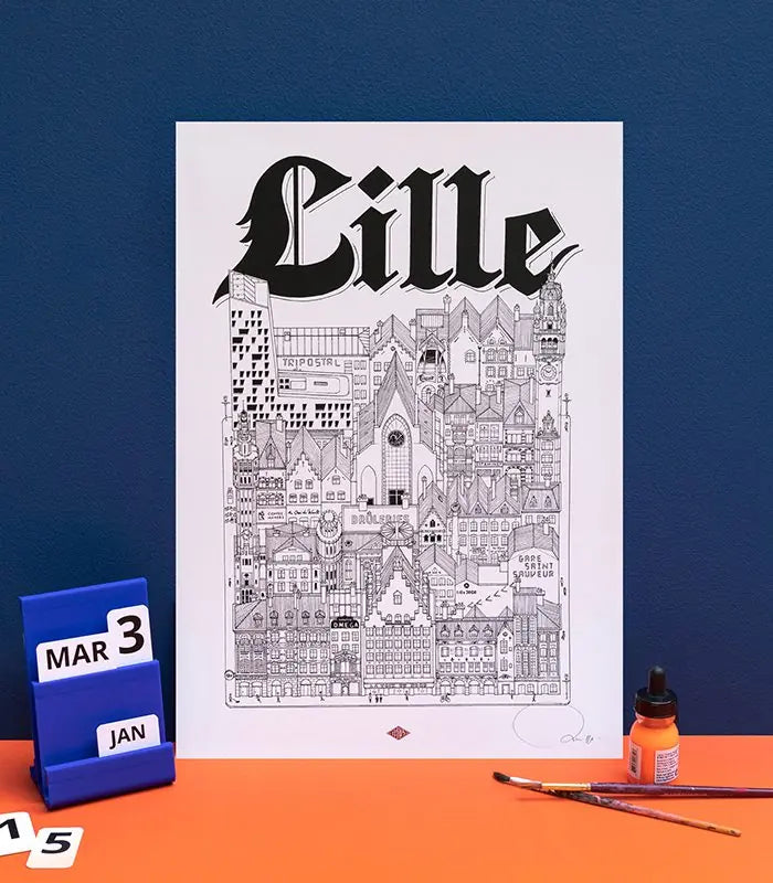 Affiche Lille A4 Docteur Paper. La collection " Travel with Me " est un carnet de voyage, Docteur Paper illustre chaque ville à son passage.