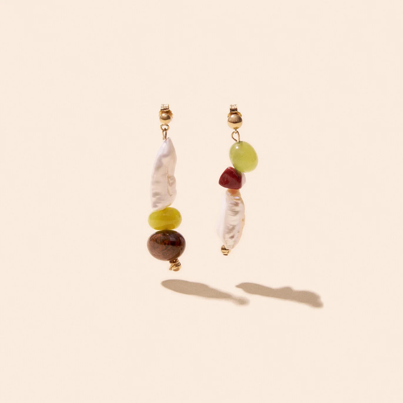 Les Boucles asymétriques Gaia Camille Colette Studio sont des boucles composées d’un enchaînement graphique de nacres et d'un mélange de pierres naturelles : Oeil du tigre, Jaspe Rouge, Jade Coréen.