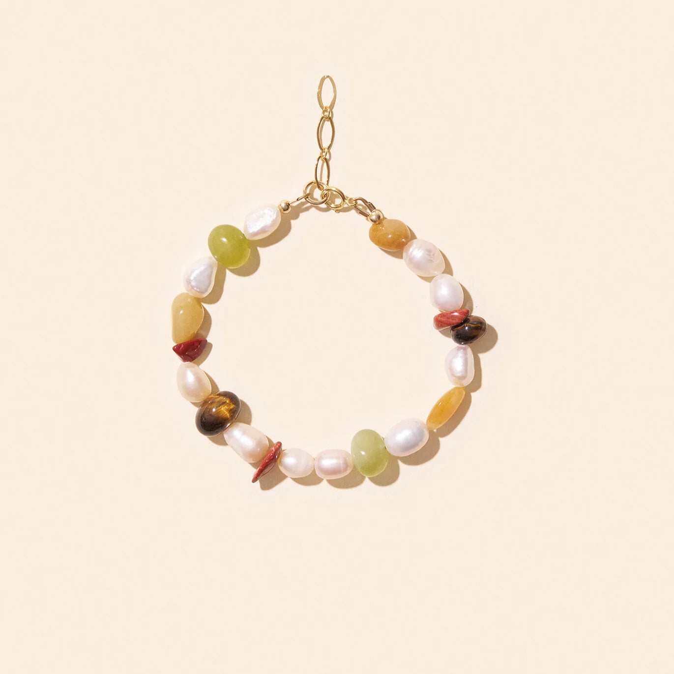 Le bracelet Gaia Camille Colette Studio est un bracelet composé d’un enchaînement graphique de nacres et d'un mélange de pierres naturelles : Oeil du tigre, Jaspe Rouge, Jade Coréen.