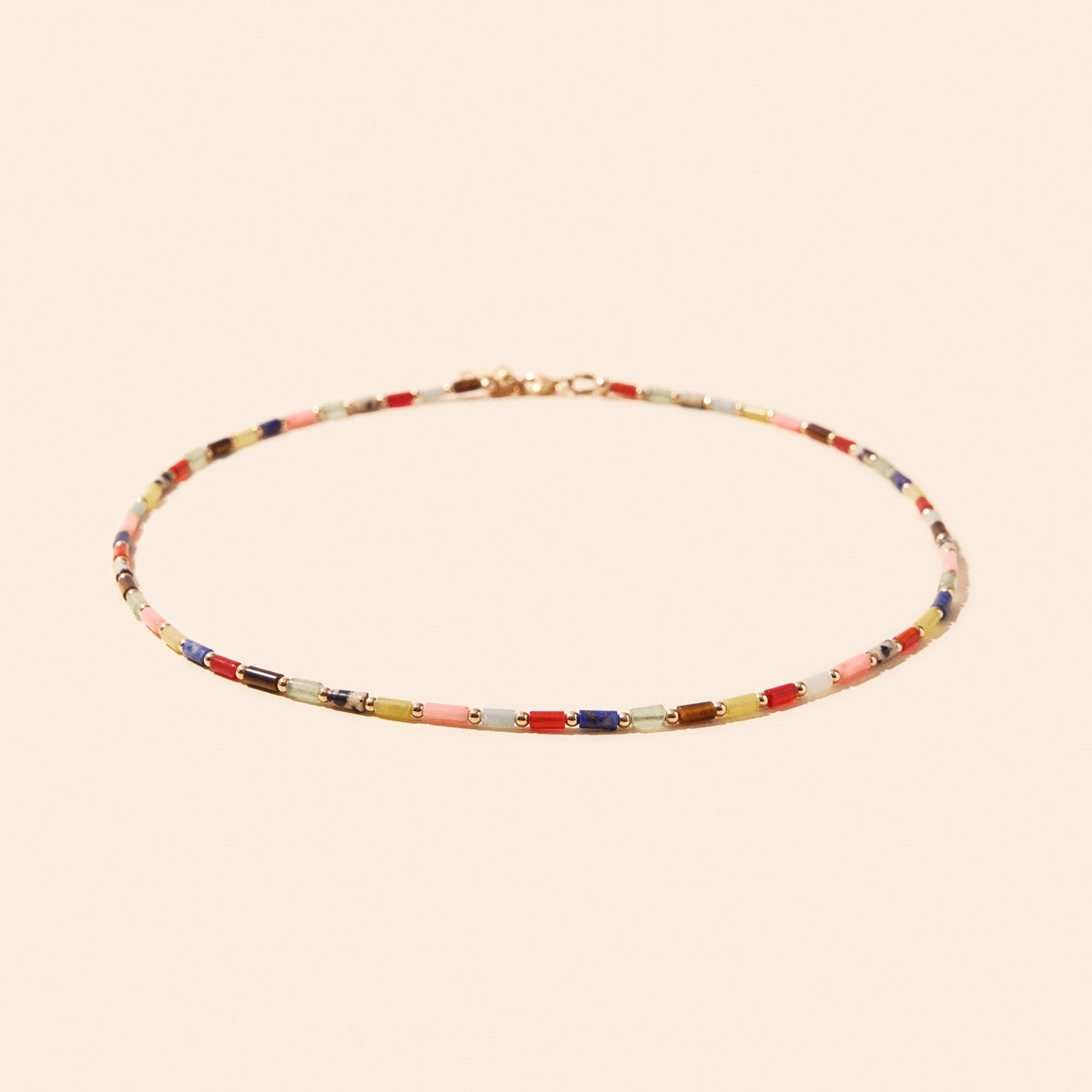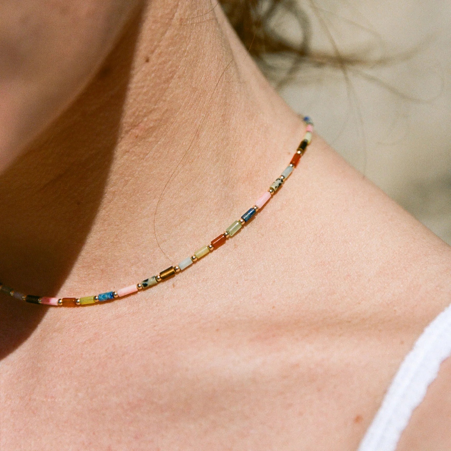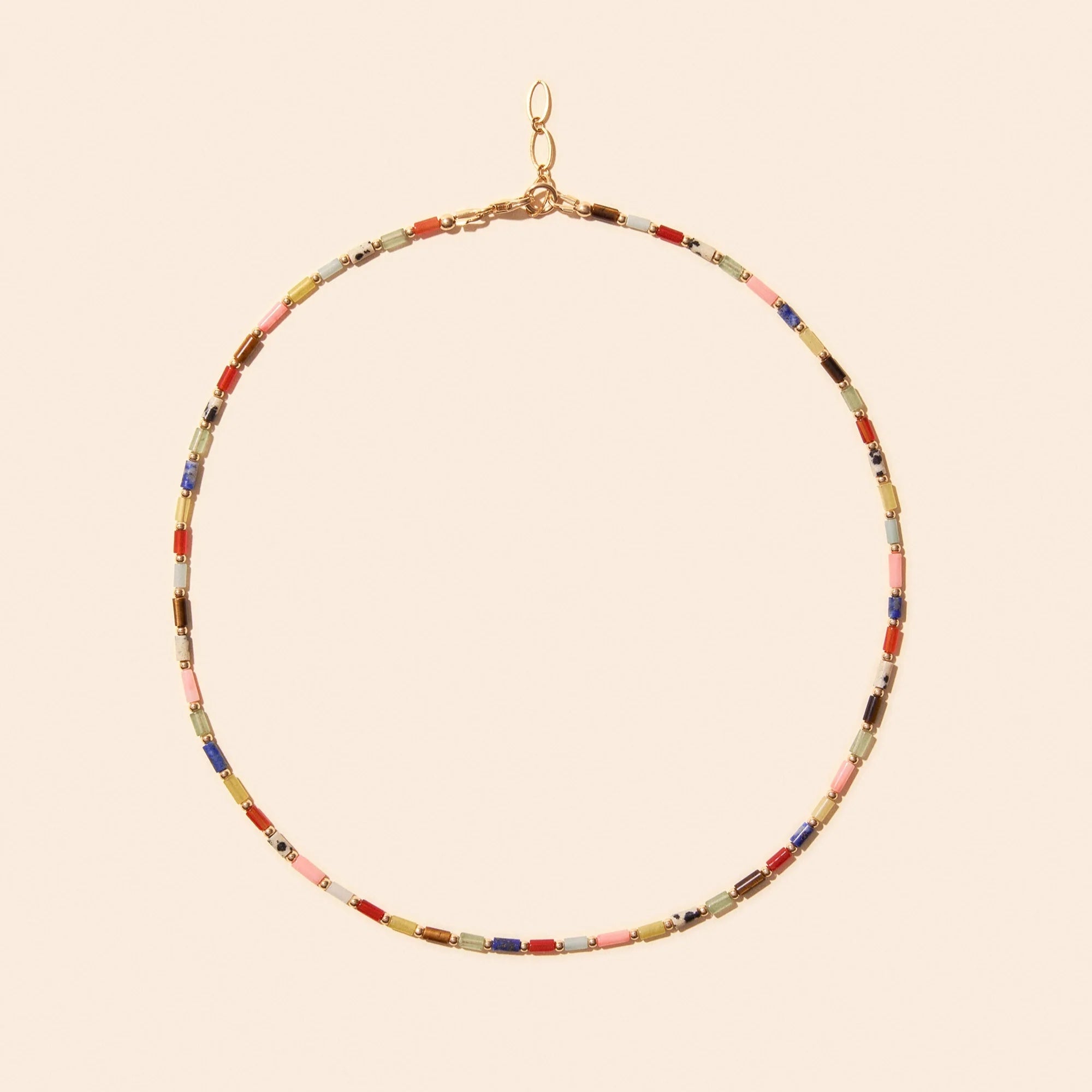 Le collier Baia Camille Colette Studio est un collier composé d’un enchaînement graphique de pierres naturelles taillées en petits tubes : jaspe dalmatien, œil du tigre, aventurine verte, bambou de mer, rhodonite, lapis lazuli et aventurine jaune. Elles sont rythmées par de délicates perles en gold filled 14 carats qui illuminent l’ensemble.