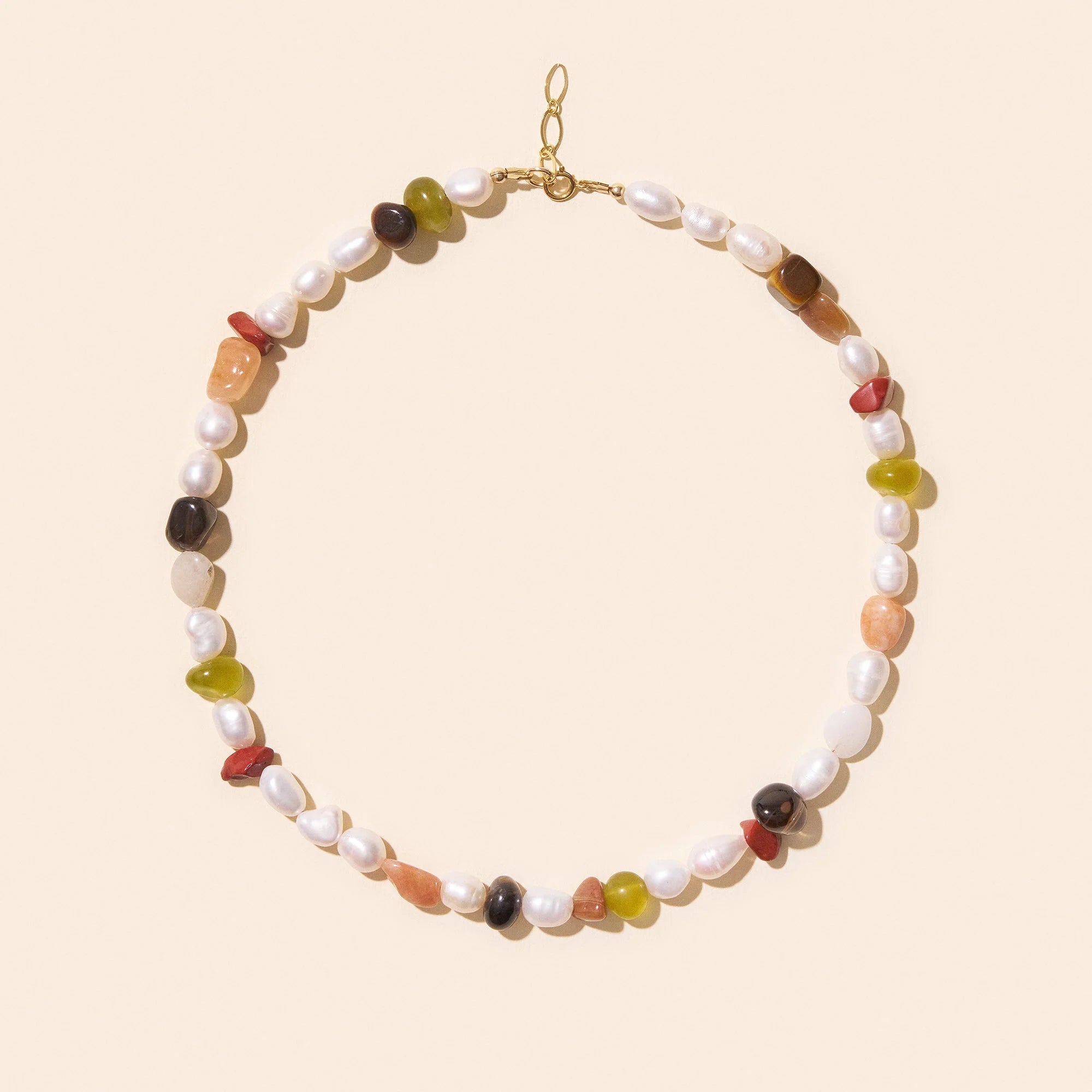 Le collier Gaia Camille Colette Studio est un collier composé d’un enchaînement graphique de nacres et d'un mélange de pierres naturelles : Oeil du tigre, Jaspe Rouge, Jade Coréen.