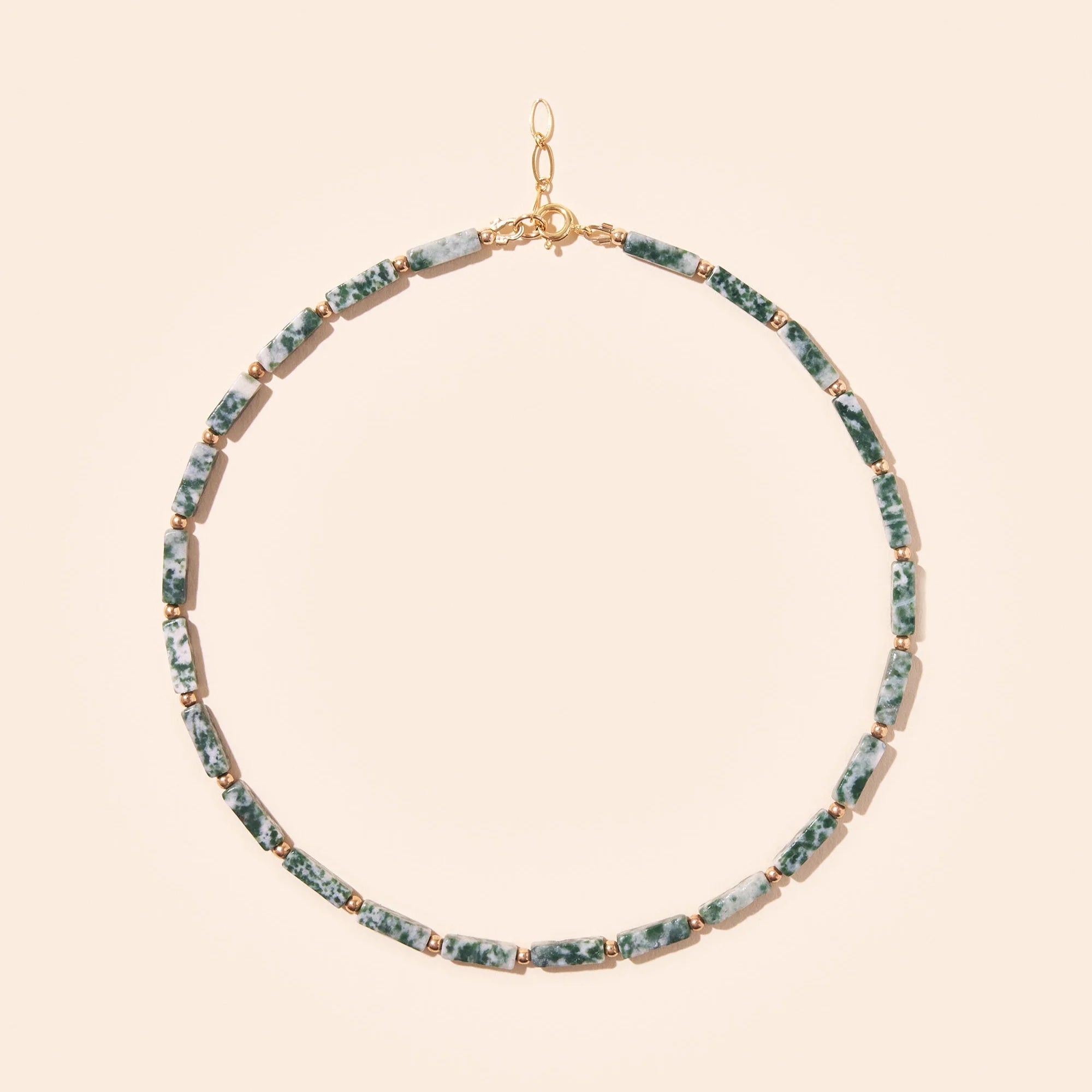 Le Collier Jaspe Verte Camille Colette Studio est un collier composé d’un enchaînement graphique de pierres naturelles rectangulaires de jaspe verte. Elles sont délicatement rythmées par de fines perles en gold filled 14 carats qui apportent lumière et élégance à l’ensemble.