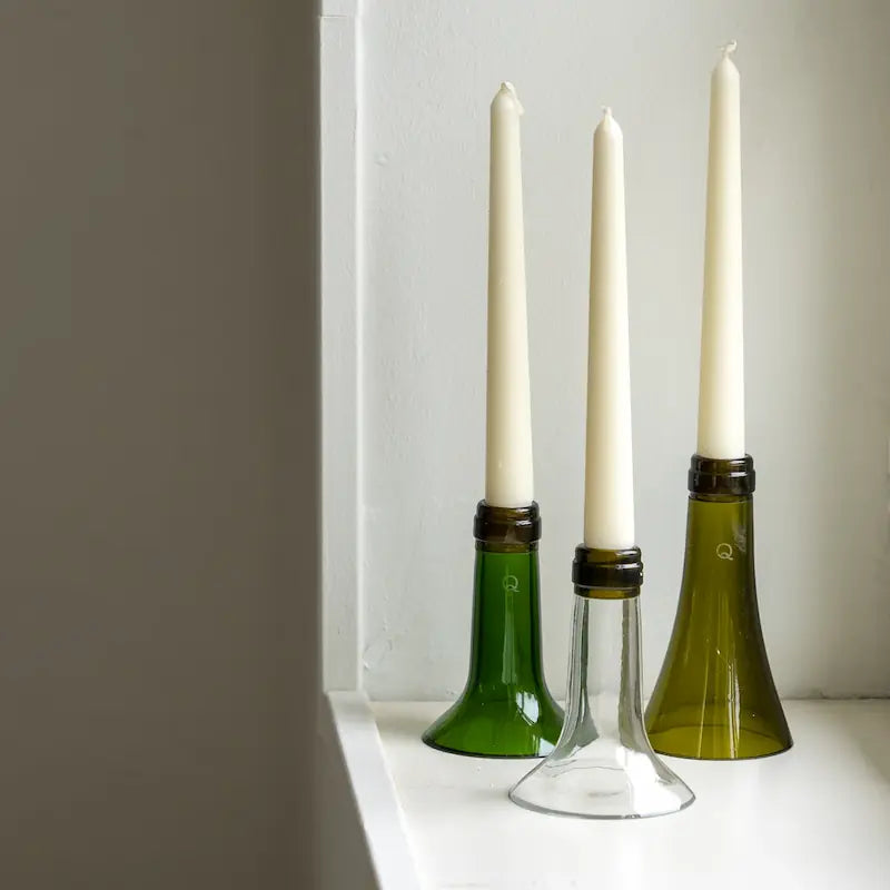 Le chandelier S Séduire/Rire QDB se réinvente. Symbole d’élégance et de raffinement, il est bien plus qu’une simple source de lumière. Depuis des siècles, le chandelier illumine les espaces avec sa grâce et sa splendeur. Q de bouteilles réinvente le chandelier à base de verre surcyclé, comme un témoin de vos instants de partage, de fête, de débat, d’amour. De cette façon, les formes et nuances s'associent librement pour une table de caractère, responsable et résolument élégante. Rien ne se perd et tout se transforme chez QDB ! Chaque pièce est unique, avec des variations de couleurs dues à la fabrication artisanale. Fabriqués en verre recyclé, compatible avec toutes bougies chandelles.