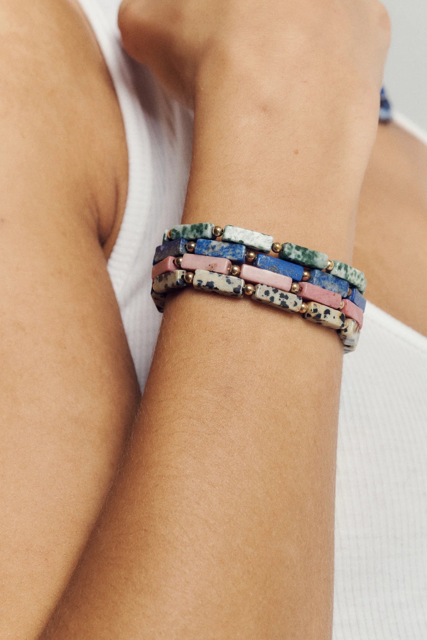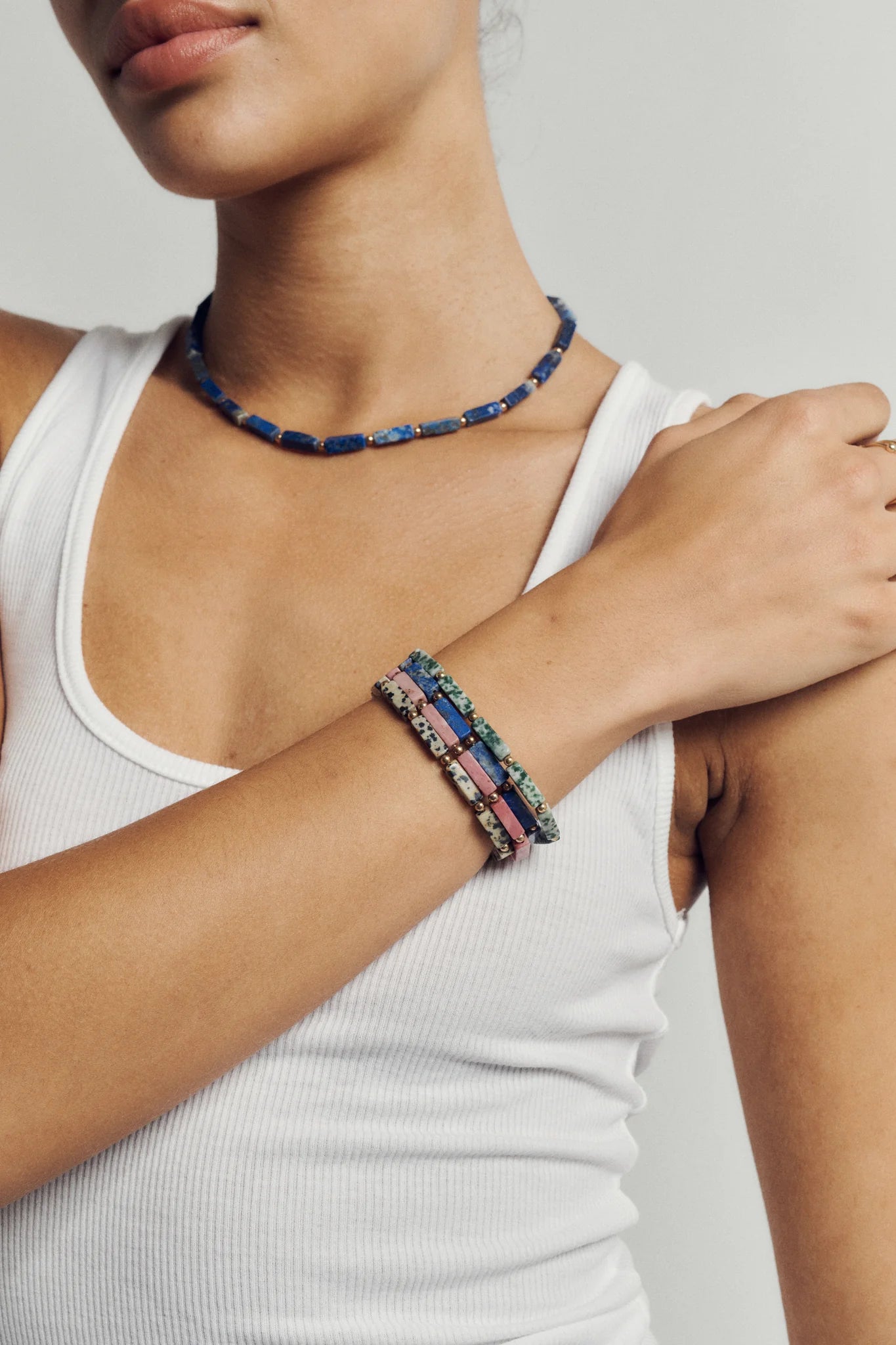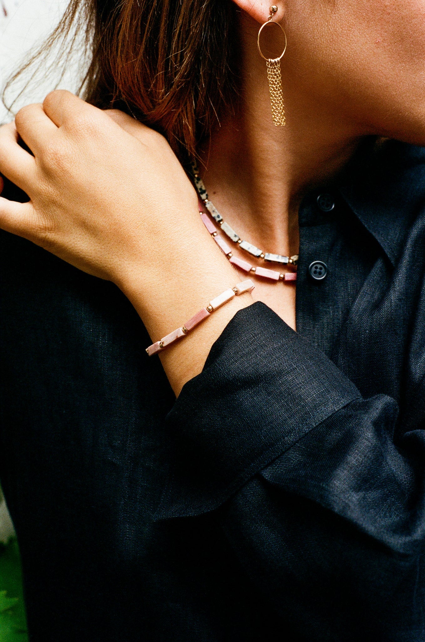 Succombez au charme singulier du Bracelet Rhodonite, une création signée Camille Colette Studio. Ce bijou d'exception met en lumière des pierres de Rhodonite taillées en formes rectangulaires, offrant un jeu de nuances vieux rose et marbrées absolument unique. Assemblé à la main avec passion dans un atelier à Bordeaux, ce bracelet est monté sur des apprêts en Gold Filled 14 carats, une alternative précieuse et durable issue majoritairement d'or recyclé. Ajustable et hypoallergénique, il est le symbole d'une mode consciente qui accompagne votre quotidien avec authenticité et éclat pour ce printemps.