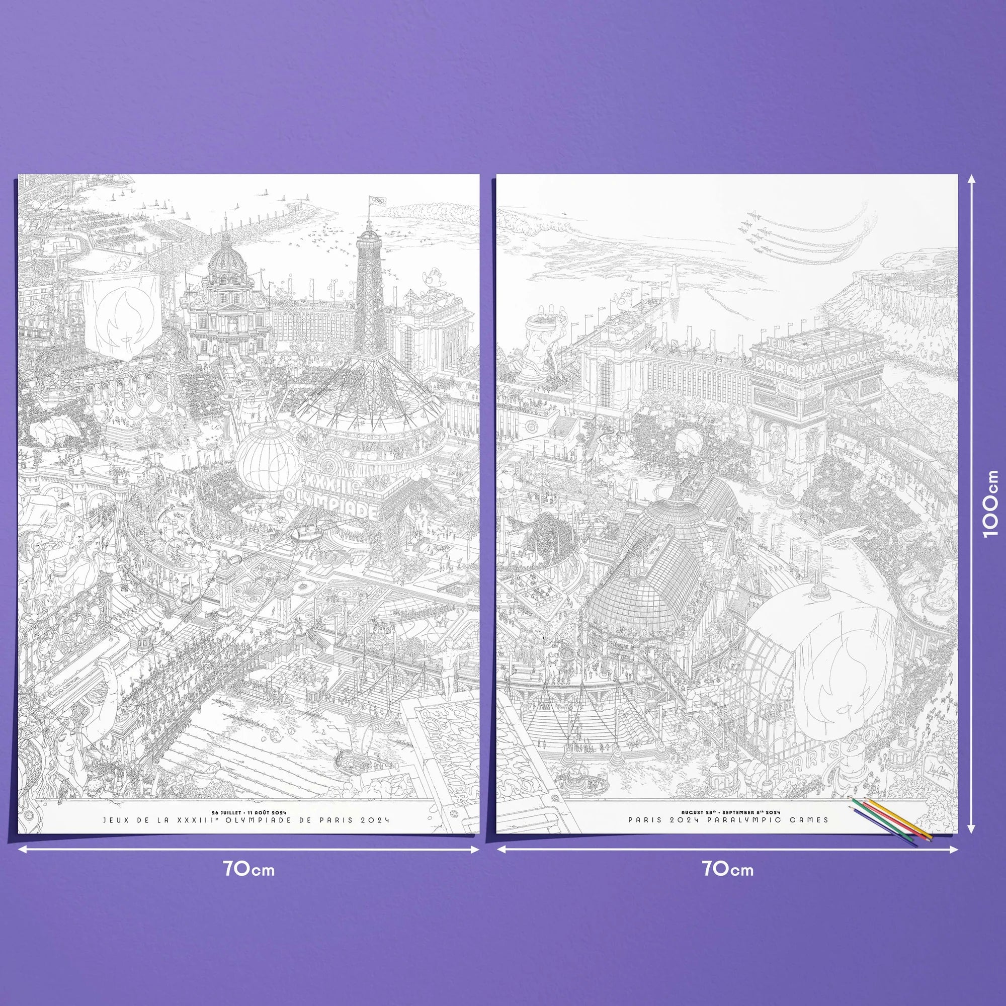 • 2 coloriages géants des JO de Paris 2024 aux dimensions 70x100cm chacun