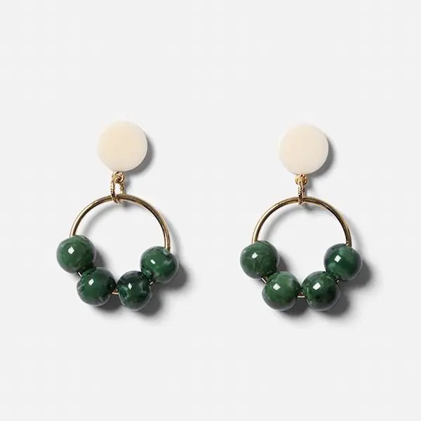 Les Boucles Diva CHIC ALORS sont des boucles d'oreilles constituée de quatre perles vertes enfilées sur un anneau doré. Un joli anneau rond suspend le pendant de perles à un petit disque de résine blanche.