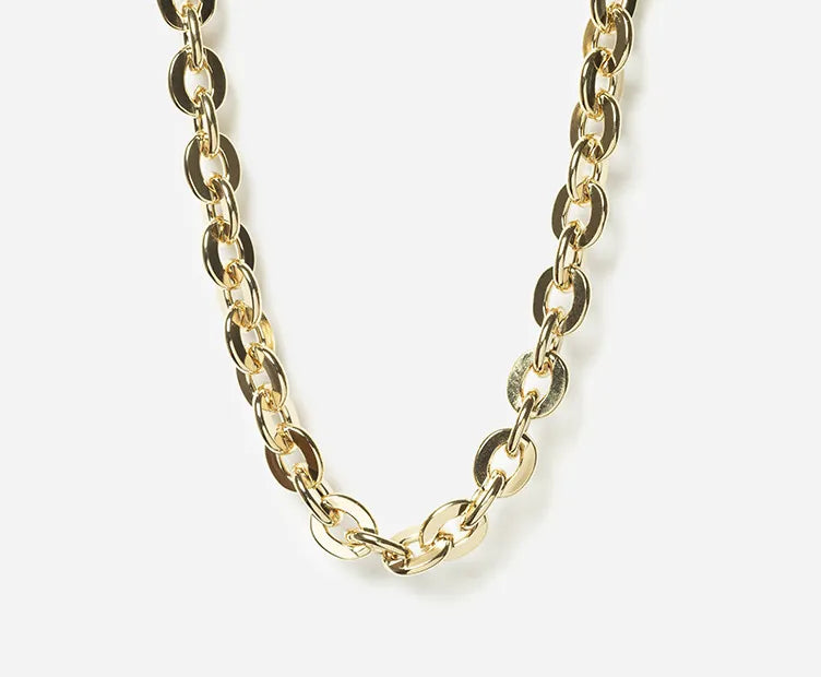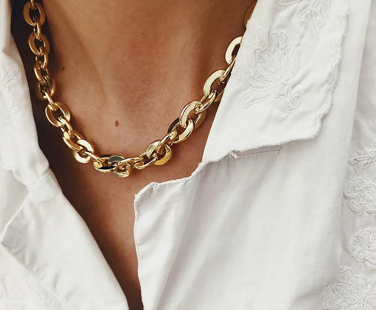 Le collier Mireille CHIC ALORS est un collier fantaisie court en grosse chaîne gourmette plate dorée, un bijou audacieux et moderne. Fabriqué en laiton doré à l'or fin 24 carats, ce collier ajoute une touche de sophistication à n'importe quelle tenue. Grâce à son fermoir anneau ressort élégant, qui peut se clipser dans tous les maillons de la chaîne, ce collier est entièrement ajustable pour s'adapter parfaitement à votre cou. Avec une longueur de 40 cm, il est conçu pour reposer gracieusement sur votre décolleté. Adoptez ce collier gourmette pour une allure chic et contemporaine, idéale pour toutes les occasions.