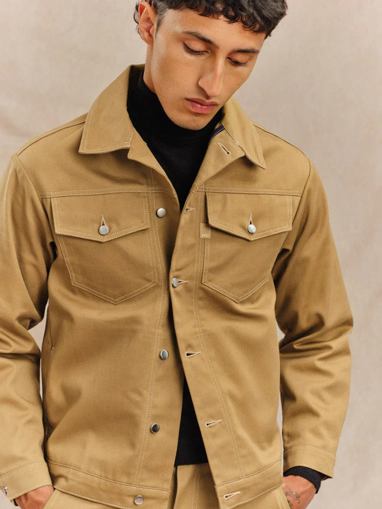 Inspirée de l’emblématique veste en jeans, la veste Nico se réinvente dans une gabardine camel lumineuse. À la fois robuste et élégante, sa coupe droite et épurée en fait un essentiel du vestiaire masculin, capable de traverser les saisons avec caractère.