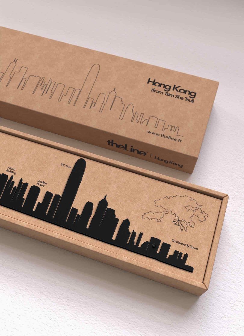 On y voit le centre de conventions et d'expositions, la banque de Chine, l'IFC Two et le Central Plaza.L'histoireThe Line commence par une photo prise un matin de 2015 à Marseille. Il est tôt, le soleil se lève derrière la colline de Notre Dame de la Garde et découpe sa silhouette en ombre chinoise. L'essentiel de Marseille est là ; la colline, la Bonne Mère, la Trouée de Vauban.Antoine décide d'en faire un objet découpé dans l'acier. L'idée a très vite beaucoup de succès à Marseille et il développe son idée : aujourd'hui, TheLine propose la silhouette de plus de quarante villes à travers le monde et s'est imposé comme une référence en matière d'objet souvenir.La marqueThe Line est une jeune marque française qui depuis 2015 retranscrit les silhouettes de villes en un trait. C’est une alternative aux objets souvenirs premier degré ; une façon élégante de représenter les lieux qui nous sont chers. Les lieux racontent beaucoup de nous, de notre appartenance, de nos rencontres, de nos voyages. Ils sont en nous et