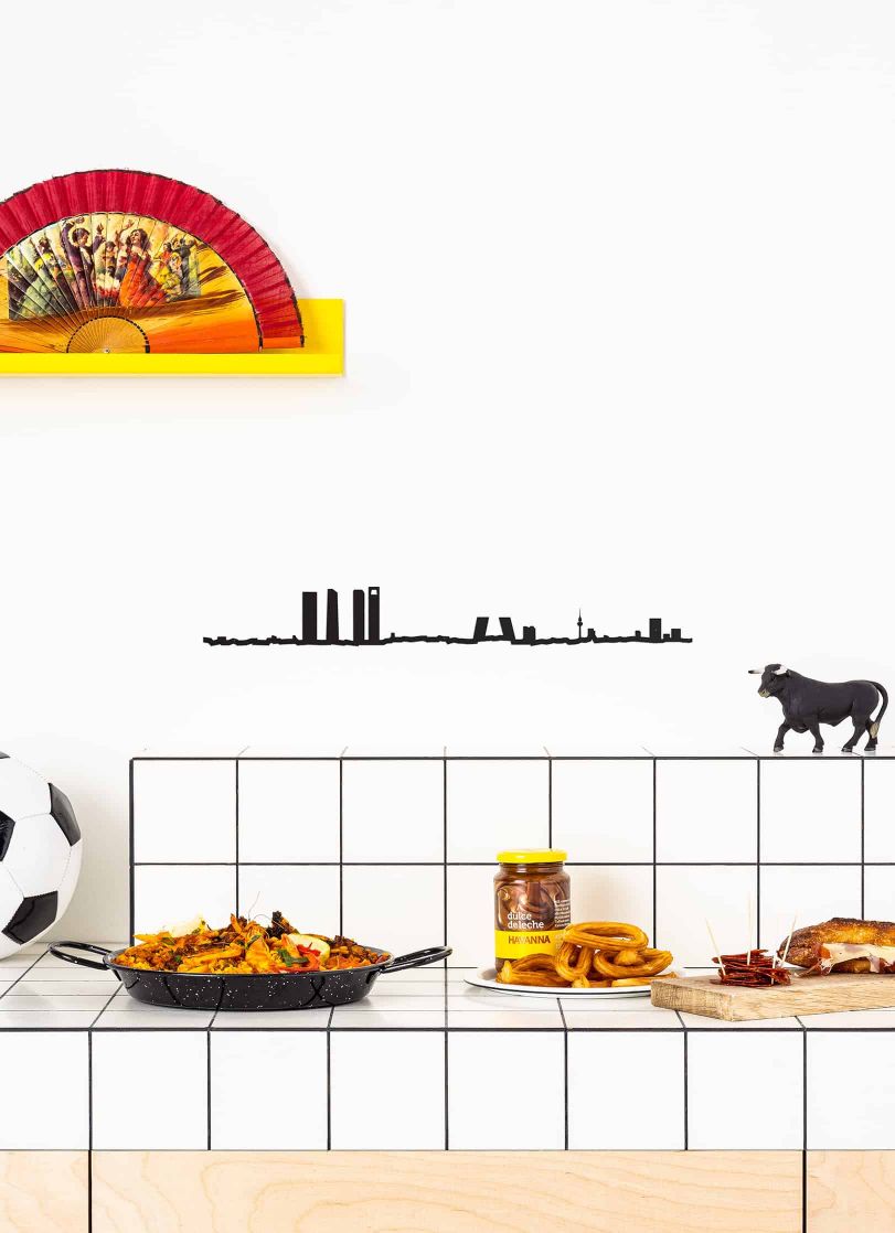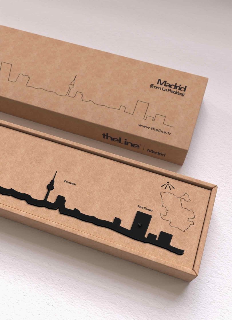 On y voit les tours de Cristal et de PwC, la Porte de l'Europe et la Torrespaña.L'histoireThe Line commence par une photo prise un matin de 2015 à Marseille. Il est tôt, le soleil se lève derrière la colline de Notre Dame de la Garde et découpe sa silhouette en ombre chinoise. L'essentiel de Marseille est là ; la colline, la Bonne Mère, la Trouée de Vauban.Antoine décide d'en faire un objet découpé dans l'acier. L'idée a très vite beaucoup de succès à Marseille et il développe son idée : aujourd'hui, TheLine propose la silhouette de plus de quarante villes à travers le monde et s'est imposé comme une référence en matière d'objet souvenir.La marqueThe Line est une jeune marque française qui depuis 2015 retranscrit les silhouettes de villes en un trait. C’est une alternative aux objets souvenirs premier degré ; une façon élégante de représenter les lieux qui nous sont chers. Les lieux racontent beaucoup de nous, de notre appartenance, de nos rencontres, de nos voyages. Ils sont en nous et