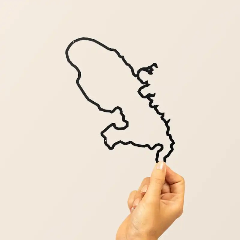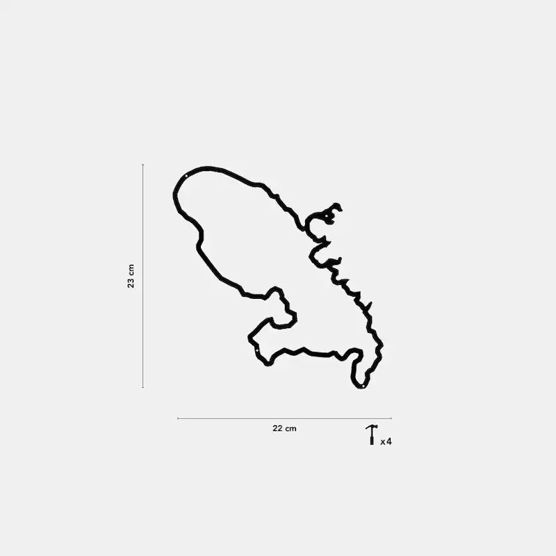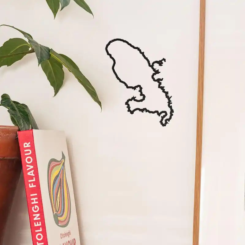 La silhouette de l'Île de la Martinique est représentée vue du ciel. On y voit du Nord au Sud : Grand'Rivière et le Mont Pelée, la Presqu'Île de la Caravelle et la capitale Fort-de-France, la Pointe du Bout et enfin Les Salines. Les silhouettes murales sont fabriquées en France, en acier epoxy, matériau recyclable à l'infini. Munissez vous d'un marteau et le tour est joué ! -