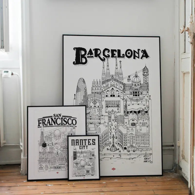 Docteur Paper illustre la ville de Nantes dans une affiche en noir et blanc très détaillée. En effet, chaque finition est minutieusement travaillée à la loupe. Enfin, fasciné par son patrimoine architectural et culturel, Docteur Paper illustre les incontournables de la ville à savoir :