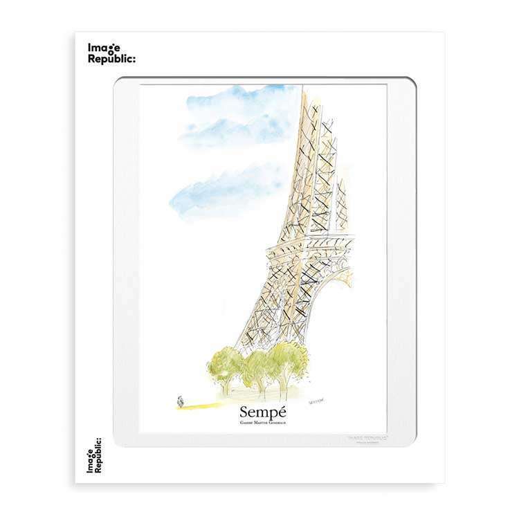 Illustration Sempé « Tour Eiffel » Image Republic, 30x40cmImage Republic édite depuis plus de 10 ans les dessins et illustrations de Jean-Jacques Sempé. Son œuvre est universelle et pour tous, synonyme d’élégance, de poésie, d’humour... Dès son adolescence à Bordeaux, Sempé rêvait de pouvoir intégrer la famille des dessinateurs du New Yorker, le prestigieux magazine américain dont il admirait l’esprit. Ce rêve devenu possible, en 1978, il se rend régulièrement à New York pour travailler avec une équipe qui lui laisse une totale liberté. Sempé dessine cent-une couvertures et autant de “cartoons” en pages intérieures, ce qui est sans précédent dans l’histoire d’un magazine américain.Jean-Jacques SempéSempé né le 17 Août 1932. Après une enfance plus que difficile, Jean-Jacques Sempé s'enferme dans ses rêveries et se met à dessiner. Adolescent, Sempé est un élève rebelle et indiscipliné. Si bien qu'il fini par être renvoyé de son collège. Il commence à travailler à 17 ans. Après avoir été l’assistant malchanceux d’un courtier en vins et s’être engagé dans l’armée, il se lance à 19 ans dans le dessin humoristique. Il quitte Bordeaux et vit difficilement à Paris en plaçant quelques dessins dans les journaux. Essentiellement dessinateur de presse, Sempé ne semblait pas vouloir faire carrière dans la BD. Il rencontre René Goscinny et en 1959. L’extraordinaire complicité du duo de jeunes auteurs formé par Goscinny et Sempé, révèle un véritable univers. La première aventure du Petit Nicolas paraît le 29 mars 1959 dans Sud Ouest-Dimanche. Pendant sept années, Goscinny et Sempé font vivre Nicolas chaque semaine, et composent 222 histoires. A travers Nicolas et ses copains, ils font vivre leurs propres souvenirs.En 1962, les Editions Denoël, envers laquelle il vouera une reconnaissance éternelle, publie son premier album de dessins humoristiques. Depuis, il travaille pour des journaux et réalise régulièrement depuis 1979 des couvertures pour The New Yorker. Jean-Jacques Sempé a publié aux Editions Denoël 26 albums de dessins humoristiques. 'Le Petit Nicolas' ainsi que ses albums sont traduits dans le monde entier. Il décède le 11 août 2022.