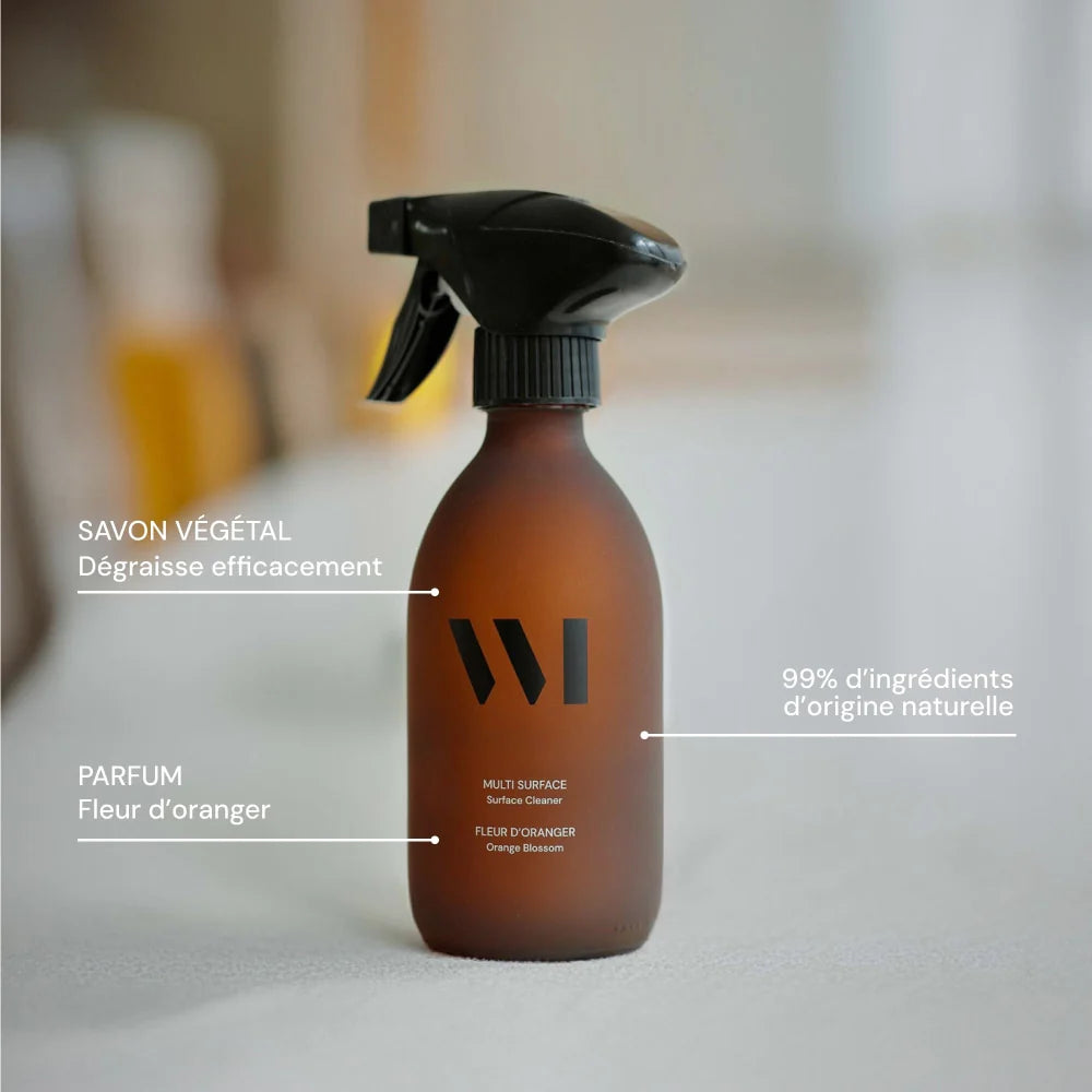 Multi-surface Fleur d’Oranger What Matters. Il élimine calcaire, saletés et graisse dans toute la maison (cuisine, salle de bain, marbre, vitres…) sans rinçage.