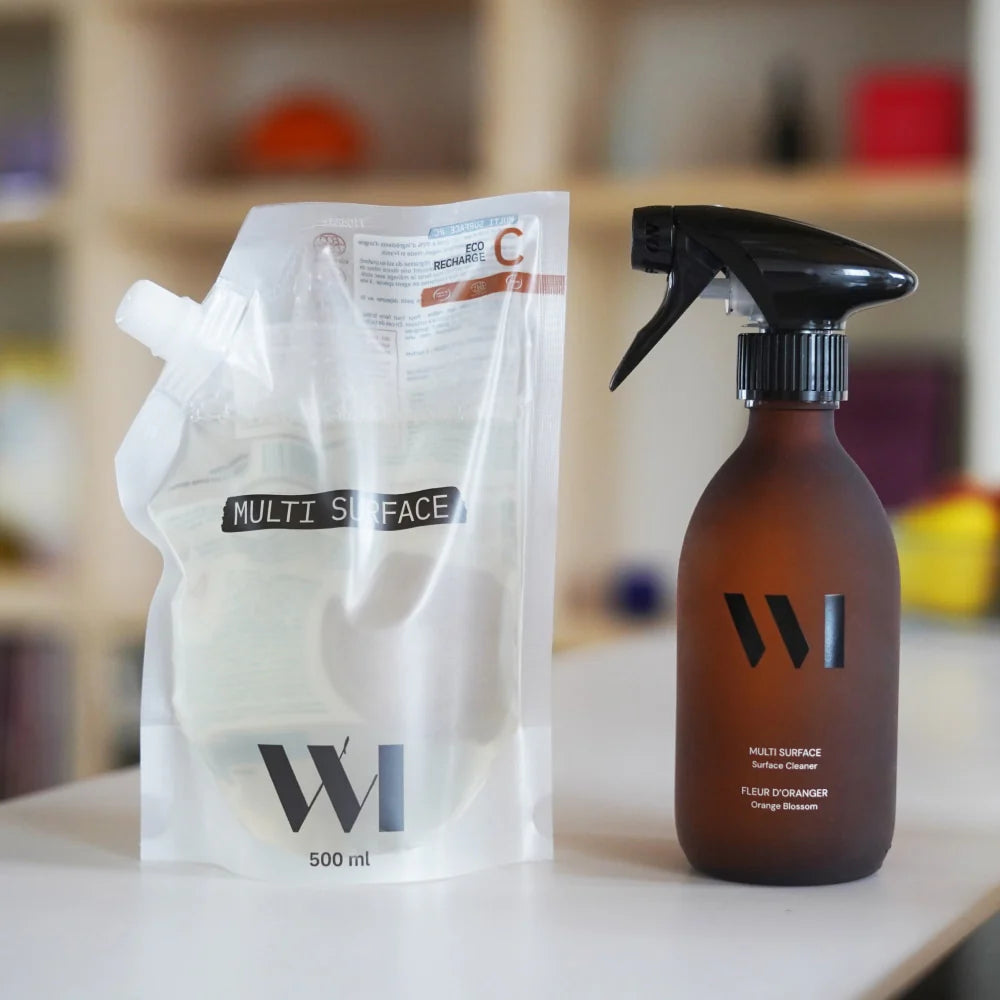 Le multi-surface est présenté dans un flacon en verre renforcé®, plus résistant aux chocs qu’un verre classique tout en restant 100% recyclable. Entièrement rechargeable, il s’intègre dans une démarche de réduction des déchets plastiques : il suffit de le recharger pour continuer à l’utiliser, sans changer de