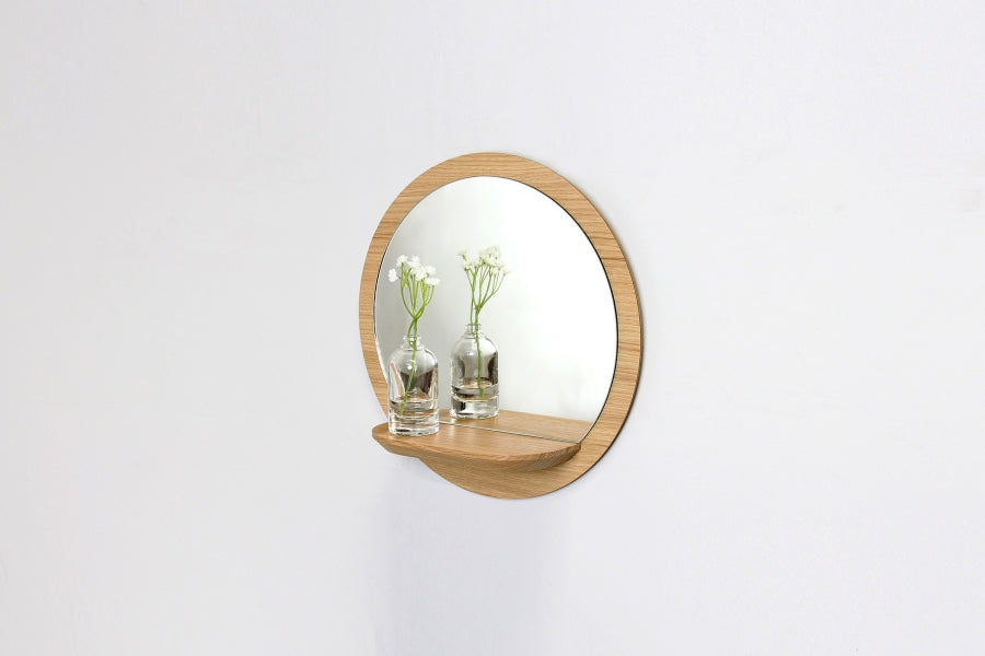Let the sunshine in ! Grâce à son étagère en chêne massif, le Sunrise est le miroir idéal pour une salle de bain ou une entrée avec son design tout en rondeur. Disponible en trois tailles.