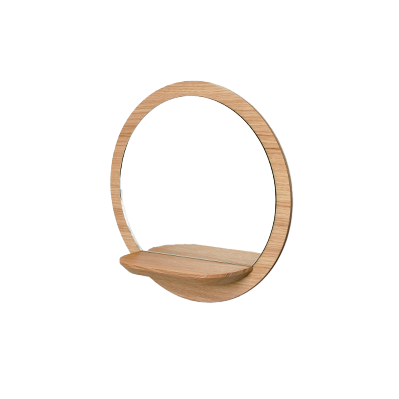 • Let the sunshine in ! Grâce à son étagère en chêne massif, le Sunrise est le miroir idéal pour une salle de bain ou une entrée avec son design tout en rondeur. Disponible en trois tailles.