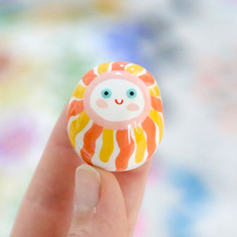 L'esprit du soleil vous aidera à rayonner ! Cet être magique se glisse dans votre poche ou se pose sur la table de nuit.Dodo Toucan aborde la céramique et le travail de la terre de manière libre, ludique et créative. Présente dans toutes les créations, la nature est une source majeure d’inspiration où Sara puise motifs et sensations pour construire son univers joyeux, frais et délicat. Le travail de la couleur, les gammes chromatiques à la fois acidulées et douces, évoquent un livre de contes.