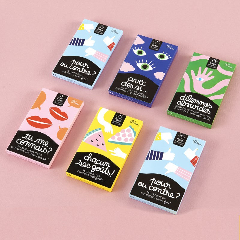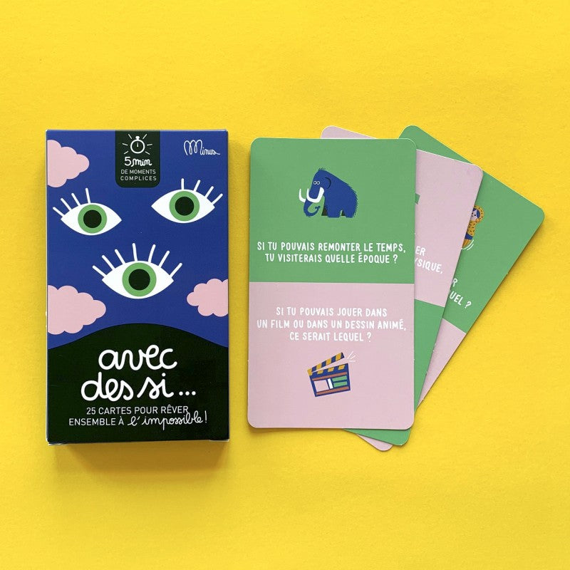 Amusez vous avec 5 min de moments complices " Avec des Si" Minus Éditions. Grâce à une bonne dose d'humour, ce kit vous offrira des moments uniques en famille et renforcera les liens entre générations. En effet, à travers 50 questions pour débattre en famille ou entre potes, sans règles compliquées, vous pouvez commencer à jouer immédiatement ! Quels choix feriez-vous si vous étiez invisible ? Si vous pouviez partir demain à l'autre bout de la planète ? Carte après carte, vous allez vous poser des questions pour débattre et réinventer le monde mais aussi votre vie ! De plus, " Avec des Si" est un jeu fabriqué imprimé en Belgique par des imprimeurs certifiés et respectueux de l'environnement. Enfin, les kits sont assemblés et préparés en France, par des travailleurs handicapés dans un ESAT.