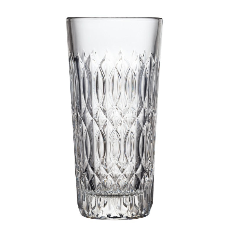 Verre long drink en verre pressé mécanique décors arabesques en relief, inspiré des collections du 19ème siècle. Le chic suranné des vaisseliers à la française d'autrefois. Idéal, pour les jus, cocktails et boissons rafraichissantes.