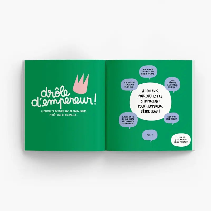 Découvrez le conte pour se raconter Les habits neufs de l'empereur MINUS Éditions. À travers un conte super drôle qui fera rire toute la famille découvrez des sujets de discussion au fil des pages pour aborder le regard des autres, le courage de dire la vérité... Profitez d'astuces pour varier le plaisir de la lecture ! Un empereur un peu trop coquet, 2 escrocs et un gouvernement qui a peur de dire la vérité... Et vous obtenez un conte méconnu d'Andersen version Minus. En parcourant l'histoire et les pages de sujets de discussion, vous allez aborder avec votre enfant le besoin du regard des autres, la force de persuasion d'un groupe et le courage.