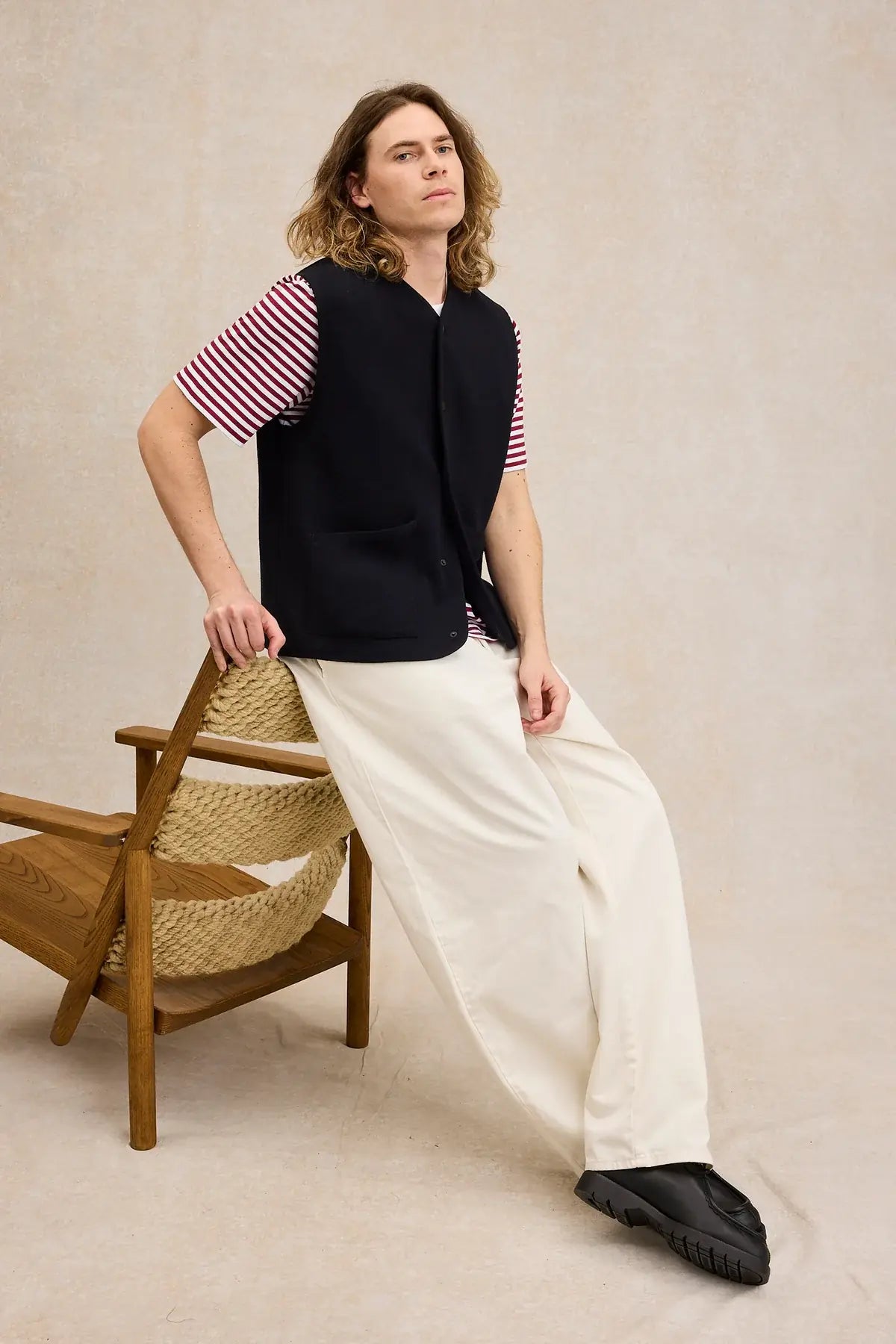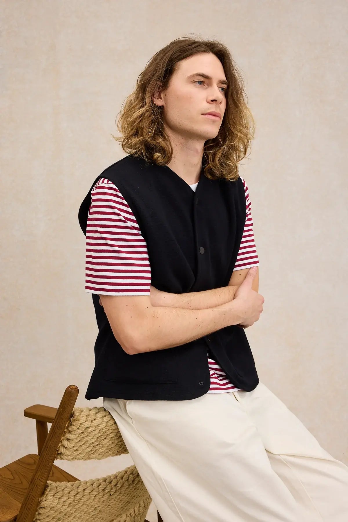 Le gilet sans manches à pressions est la pièce hybride que tout vestiaire masculin élégant réclame. Confectionné en maille Milano de laine mérinos, il offre une structure proche de l'art tailleur tout en conservant la souplesse et le confort du tricot breton. Avec son coloris bleu marine intemporel, il devient l'accessoire indispensable pour maîtriser l'art du "layering" (l'accumulation de couches) dès les premiers jours du printemps.