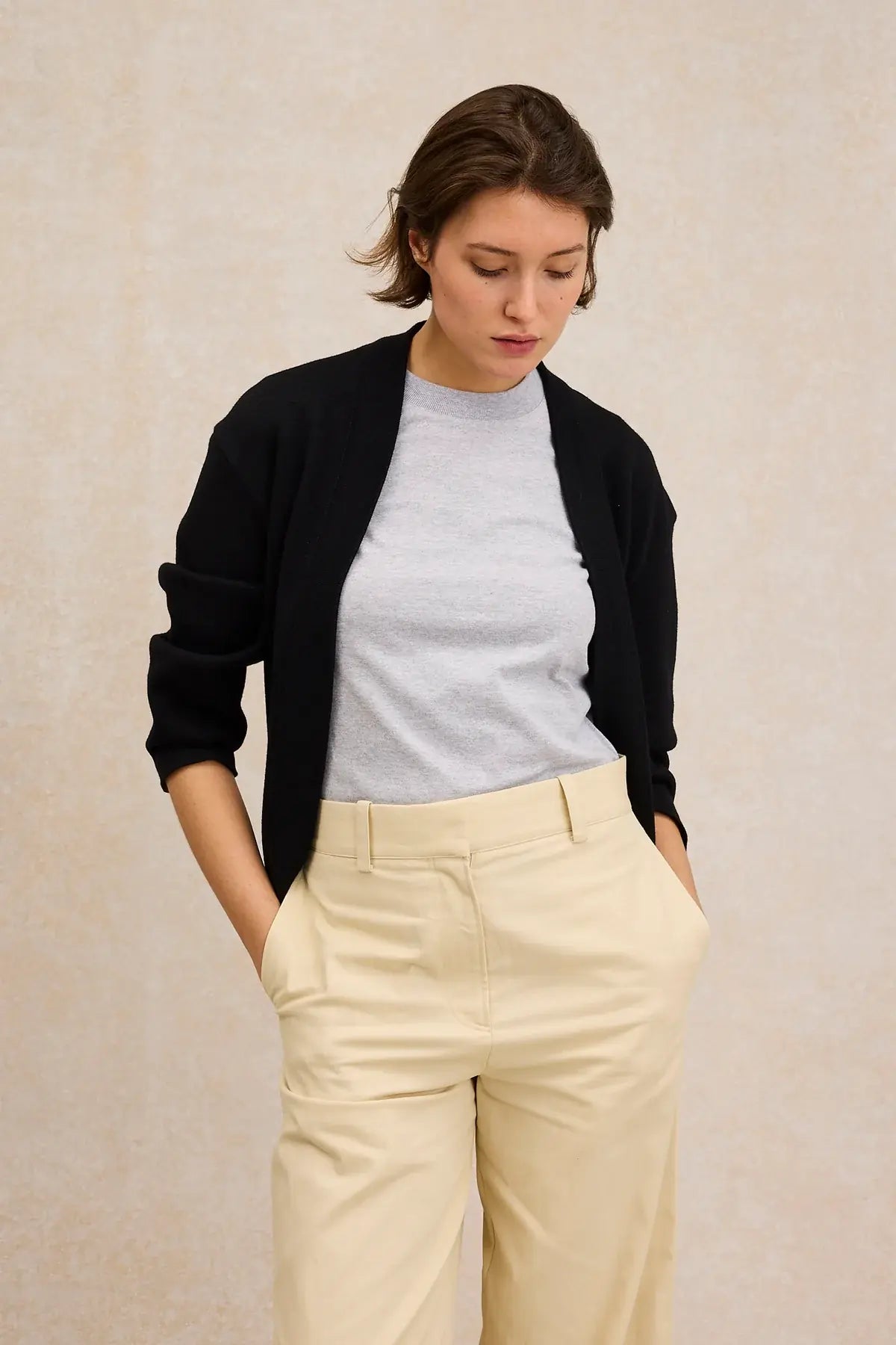 Le Kimono Milano pour femme de la manufacture Le Minor redéfinit les codes de la maille française. Sa force réside dans son tricotage "Milano", une technique qui donne au vêtement une densité et une structure proches d'un tissu de confection, tout en gardant la souplesse du tricot. Réalisé en laine mérinos, ce kimono noir est la pièce de transition parfaite pour le printemps et l'été. Chez CQFD Avignon, nous avons été séduits par ce mariage entre l'esthétique minimaliste japonaise et la technicité historique de l'atelier breton. C’est un vêtement qui traverse les saisons et les modes sans perdre de sa superbe.
