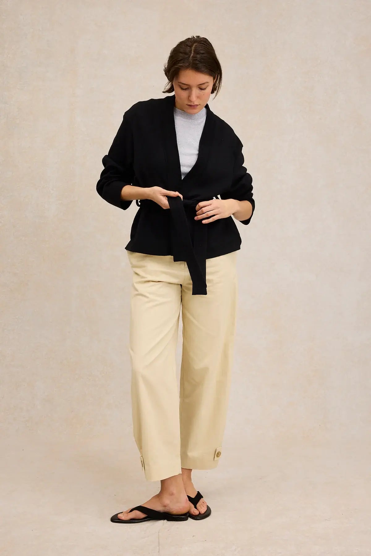 Le noir intemporel de ce kimono en fait une base de garde-robe inépuisable. Pour une silhouette élancée, portez-le fermé avec sa ceinture sur un pantalon taille haute. Pour un look plus urbain et décontracté, laissez-le ouvert sur un t-shirt en coton bio ou une marinière. Sa coupe légèrement ample s'adapte à toutes les morphologies (nous vous conseillons de prendre votre taille habituelle). Disponible dans notre concept-store d'Avignon ou en ligne, le Kimono Milano Le Minor est l'investissement idéal pour celles qui recherchent une mode locale, humaine et résolument élégante.