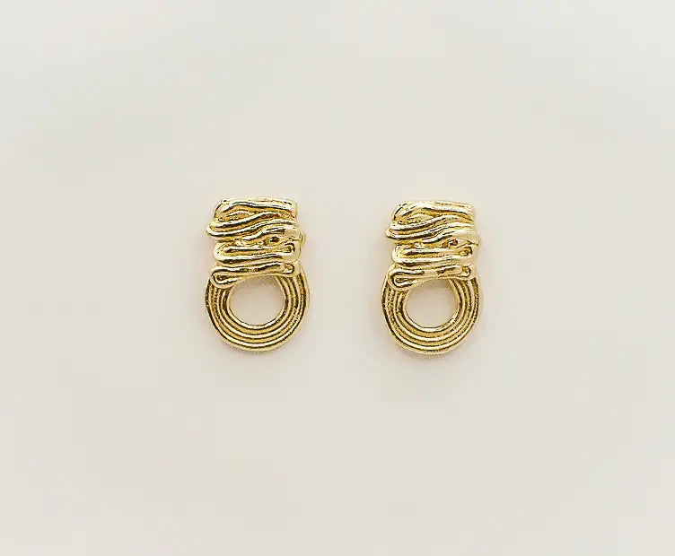 Les Boucles Tali mêlent un design organique et une symbolique forte : une puce sculptée comme un ruban de métal ondulé et un anneau lisse, net, presque ritualisé.