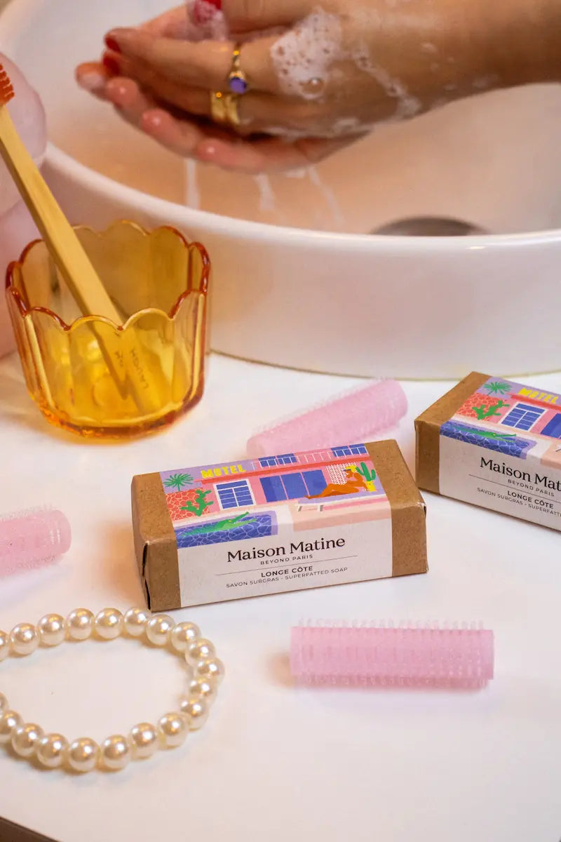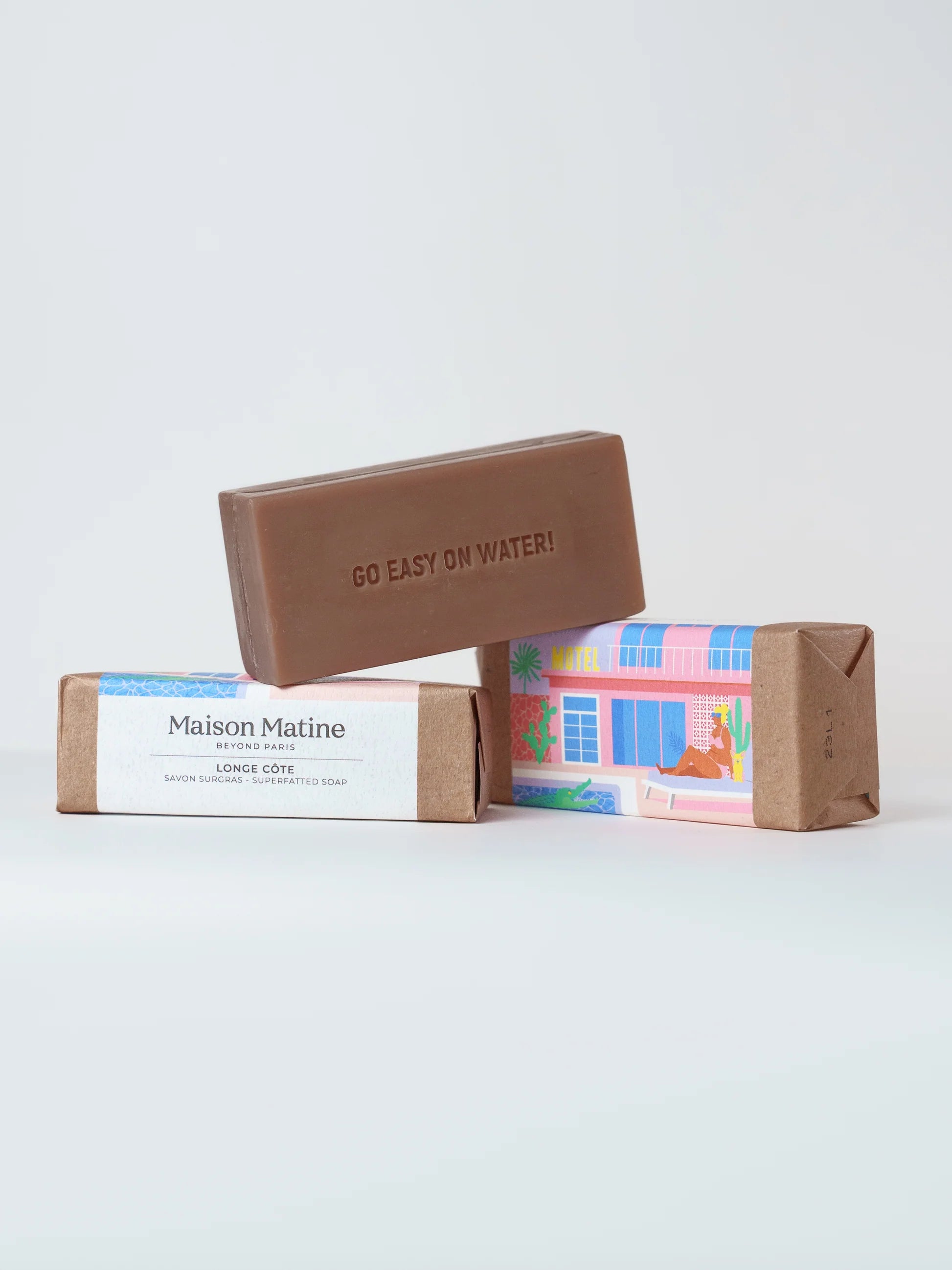 Avec Longe Côte, c’est l’été toute l’année ! Un savon surgras à 96 % d’ingrédients d’origine naturelle, formulé à base d’huile d’olive et d’huile de coco, pour une peau douce, souple et nourrie. Fidèle à l’esprit solaire et graphique de Maison Matine, il transforme la routine en véritable escapade.