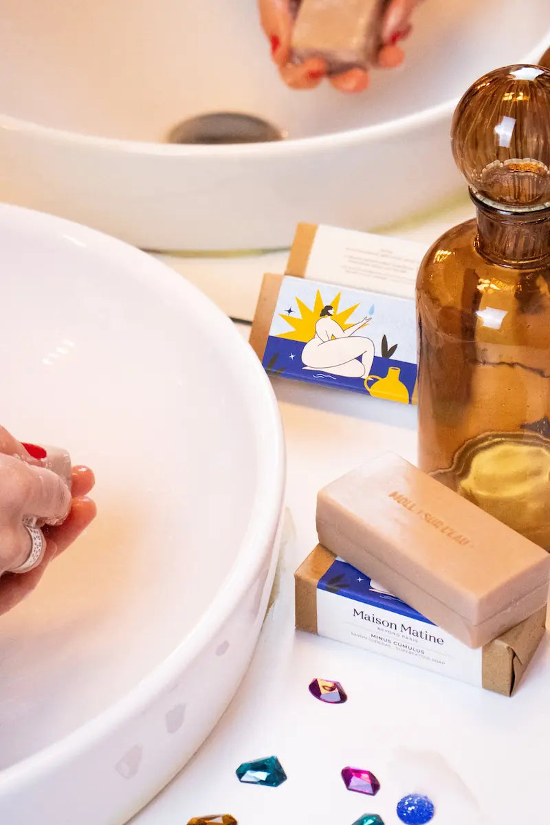 Minus Cumulus, c’est la parenthèse douce et sucrée qui invite à sortir de sa bulle… tout en douceur. Ce savon surgras formulé à 96 % d’ingrédients d’origine naturelle associe l’huile d’olive et l’huile de coco pour une mousse onctueuse et une peau souple et nourrie. Fidèle à l’univers graphique et joyeux de Maison Matine, il offre une expérience sensorielle réconfortante.