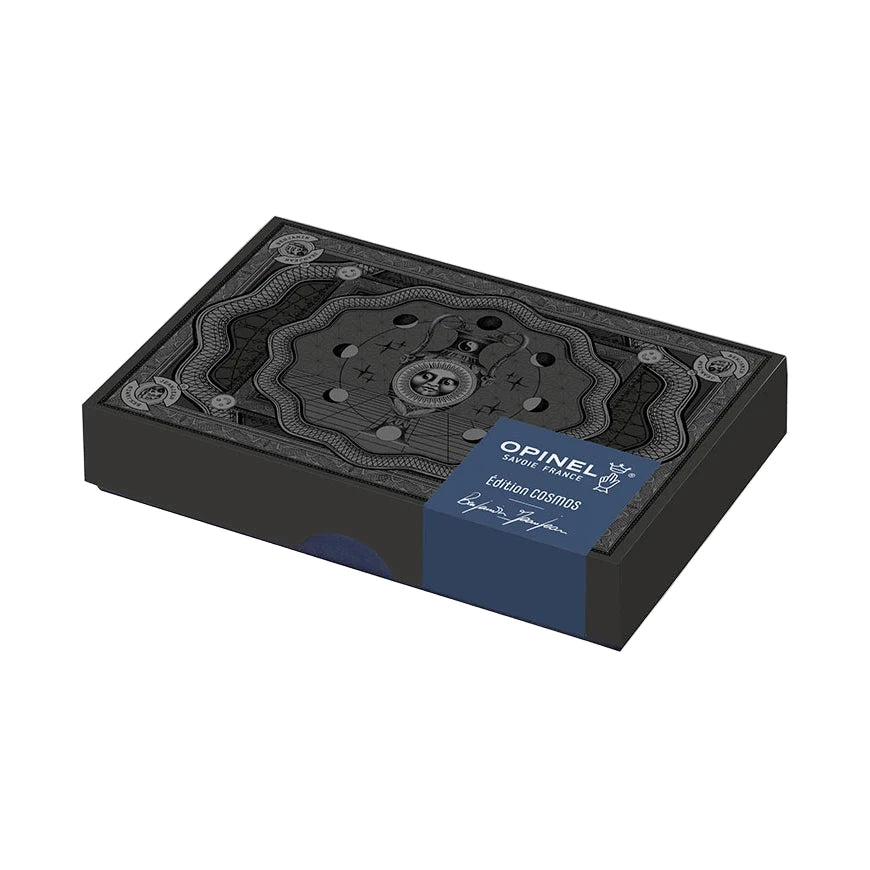 L’artiste Benjamin Jeanjean signe une interprétation poétique du cosmos sur le célèbre couteau de poche Opinel N°08. Son illustration mêle symbolisme et mystère : visage solaire symbole d’équilibre, phases lunaires évoquant le cycle du temps, motifs géométriques comme une toile cosmique… Une rencontre entre tradition et modernité.