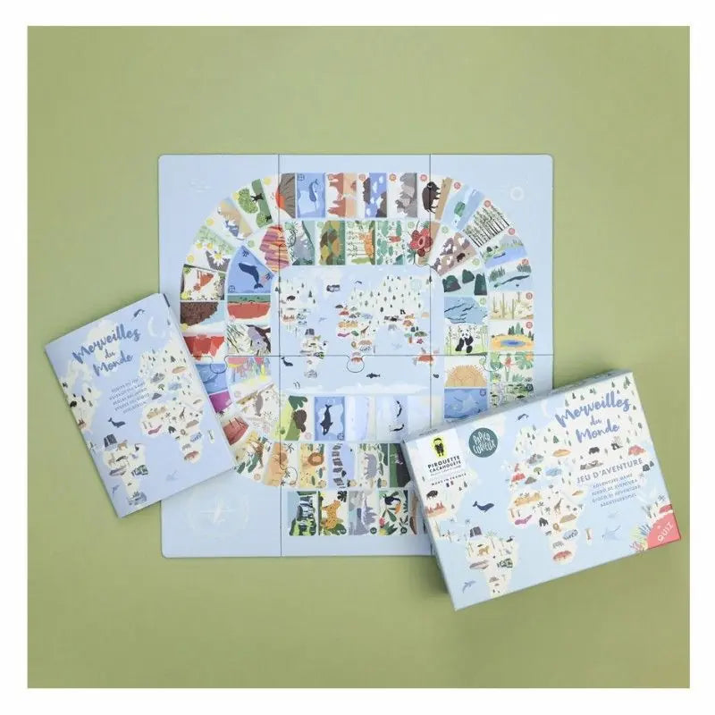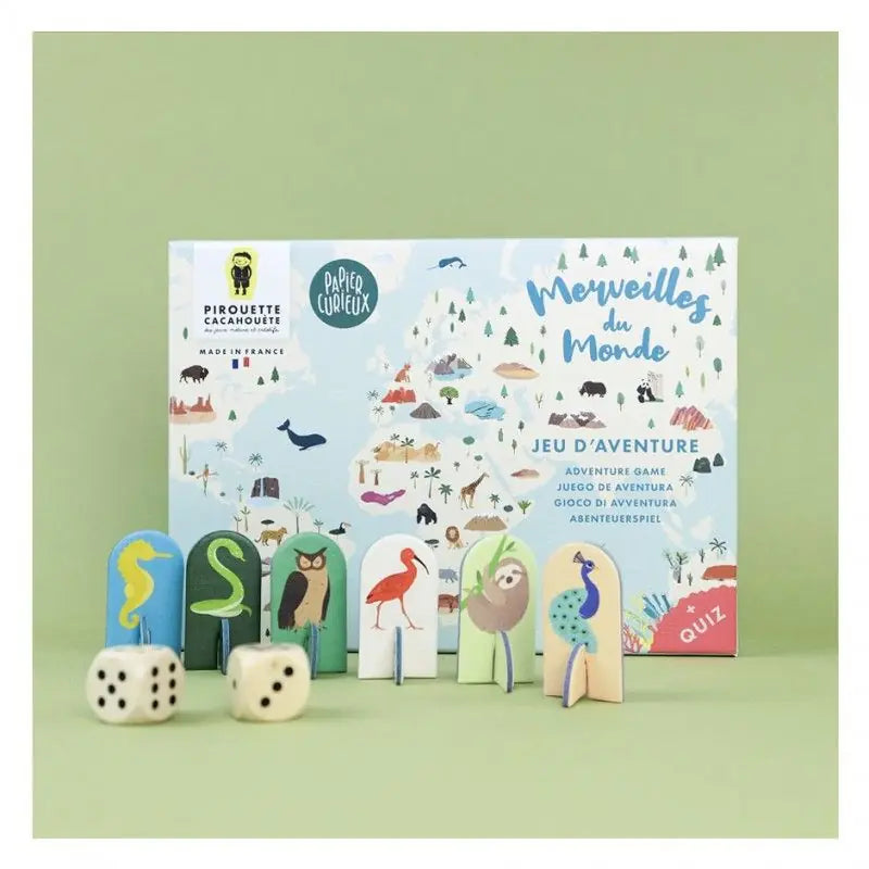 Pirouette Cacahouète présente le jeu “Merveilles du Monde”, un grand voyage autour des merveilles naturelles de notre planète ! En collaboration avec la marque française Papier Curieux, ce jeu réinvente la célèbre spirale du jeu de l’Oie pour offrir une aventure à la fois ludique, éducative et pleine de découvertes.