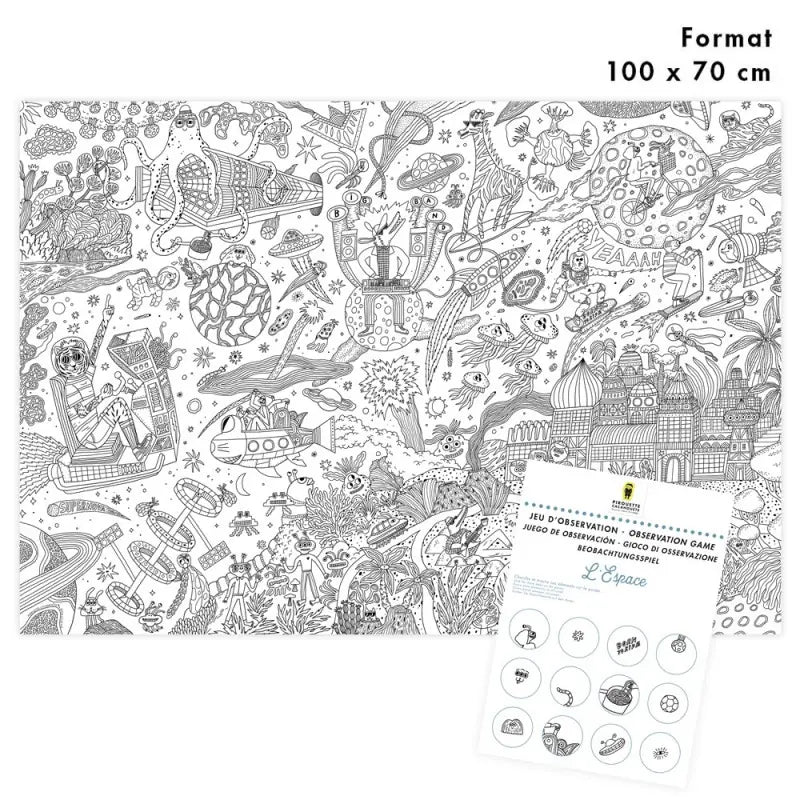 Découvrez le poster géant à colorier Espace, un coloriage XXL fabriqué en France. Pirouette Cacahouète dévoile son grand poster à colorier sur le thème de l'Espace : fusées, planètes, étoiles, vaisseaux et extraterrestres à explorer et colorier. Parfait pour… Une fête d’anniversaire, un après-midi créatif, ou un moment calme en famille.