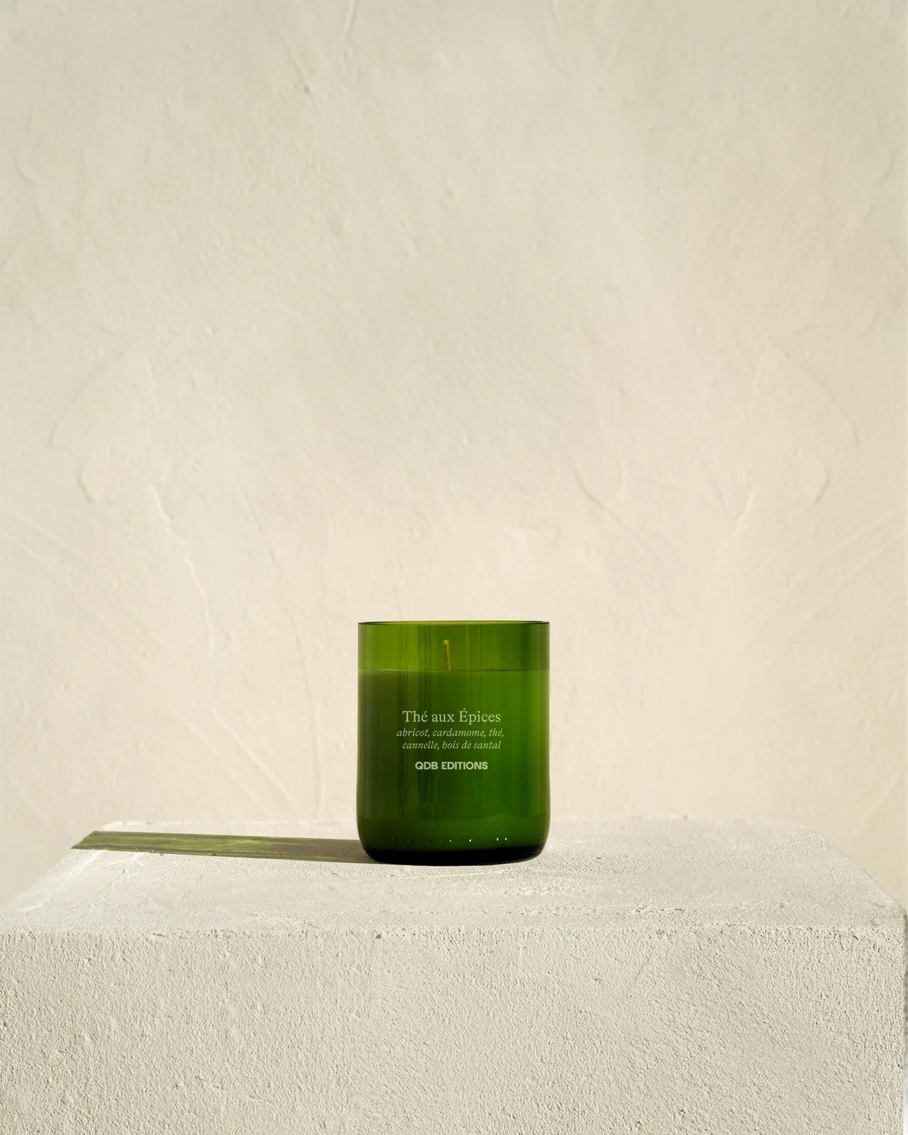 La Bougie parfumée Thé aux Épices QDB Éditions est une bougie façonnée à partir d’une bouteille de vin, transformable en verre Q de Bouteilles une fois la bougie consumée. Le choix d'une bouteille de vin à fond plat permet à la bougie de se consumer quasiment entièrement et de ne pas gaspiller de cire.