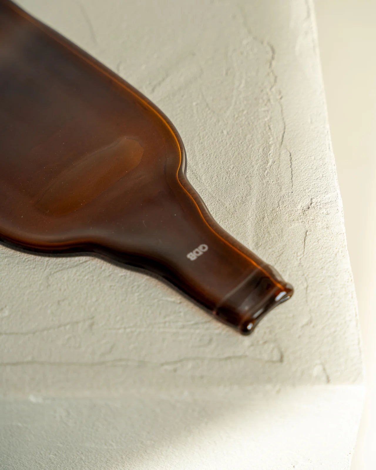 La Planche apéritive medium Ambré QDB Éditions est façonné à partir d’une bouteille de bière aux nuances brunes orangées qui a été chauffée pour en moduler la forme. Chaque pièce est unique, avec des variations de couleurs dues à la fabrication artisanale.