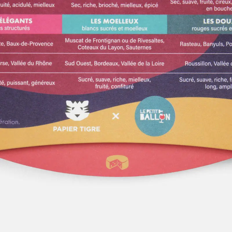 Découvrez la roue du Caviste Papier Tigre, une création ingénieuse pour des moments gastronomiques parfaits ! Évitez les faux pas et sublimez vos repas en proposant des accords mets-vins harmonieux, adaptés à chaque plat et à chaque occasion. Ce disque recto-verso, doté d'une accroche métallique, est conçu en partenariat avec Le Petit Ballon, expert en vins. Avec 8 catégories, ce guide vous accompagne dans toutes les situations, des entrées aux desserts en passant par les fromages et les plats principaux. Plus besoin de deviner : laissez-vous guider par les saveurs.