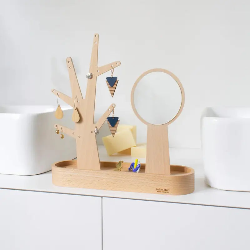 L'arbre à bijoux Eden Reine Mère est un rangement pour bijoux combiné à un miroir à main, fabriqué en France. Il est conçu en bois de hêtre massif et médium plaqué hêtre, issu de forêts gérées durablement (label FGD). Le miroir est en verre sans cuivre. Fabriqué à Toulouse, dans le Jura et dans l'Yonne, il allie esthétique et utilité pour ranger vos bijoux tout en apportant une touche élégante à votre décoration.