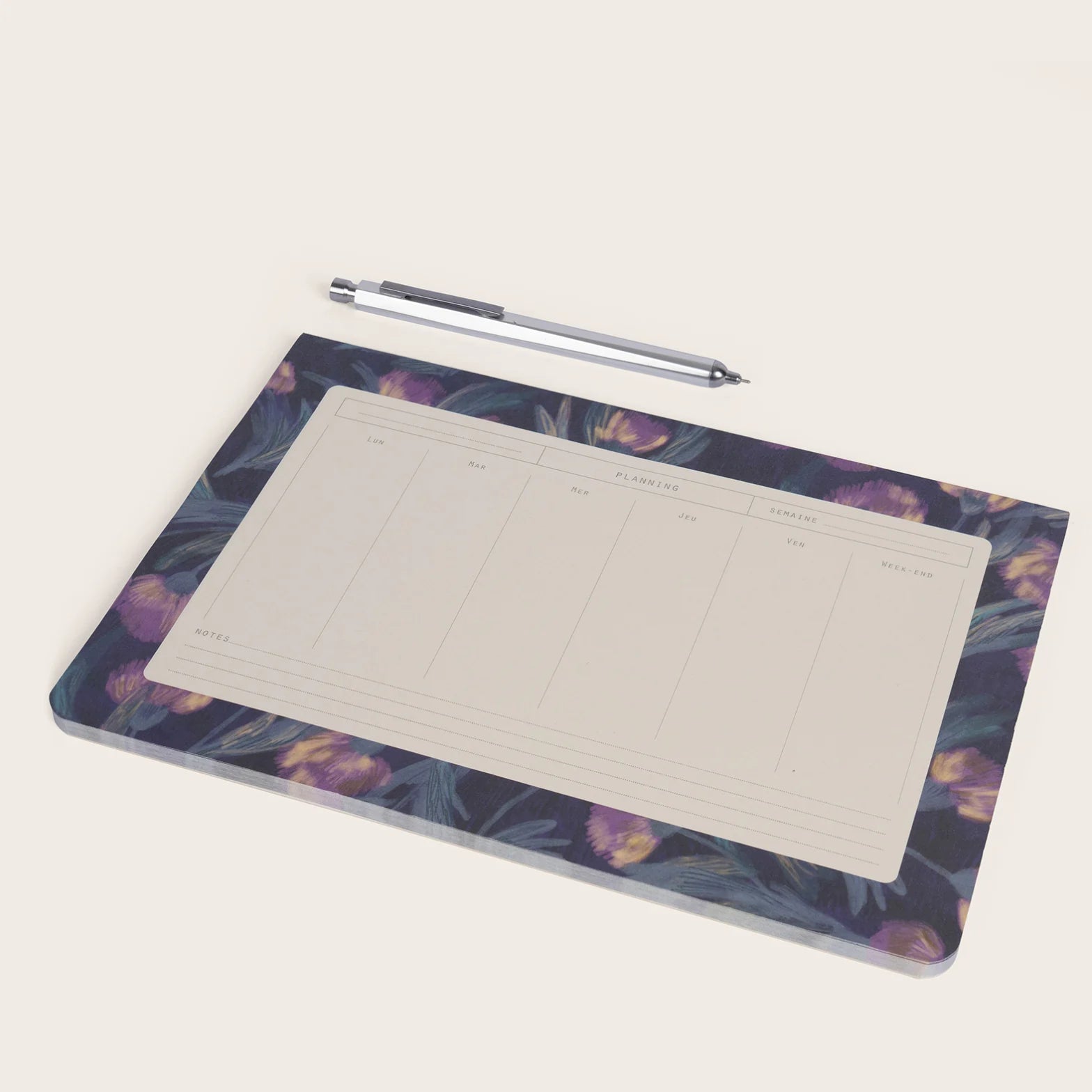 Laissez la poésie sauvage de l'Écosse s'inviter sur votre bureau. Le semainier Alba se pare de grands chardons entrelacés, où les éclats de parme et de bleus-verts contrastent avec élégance sur un fond sombre. Avec ses 52 pages détachables, il vous permet de planifier vos semaines avec clarté tout en apportant une touche artistique et mystérieuse à votre espace de travail.
