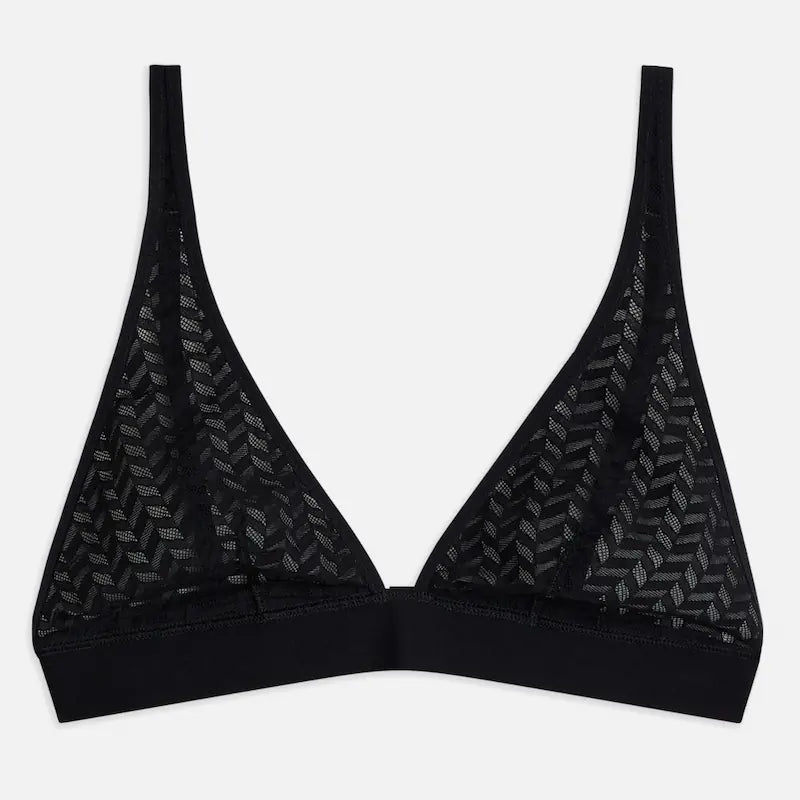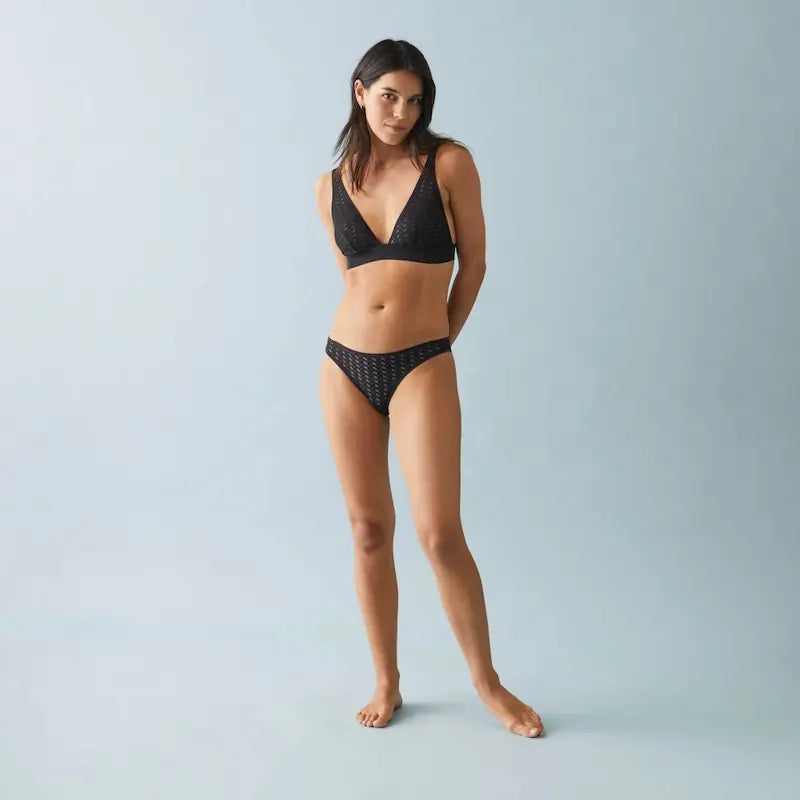 Le triangle Agathe dentelle noir Le Slip Français est en dentelle française à motif chevrons. Il est constitué d'une pointe d'élasthanne pour le confort et un maintien amélioré. On aime la bande élastique gros-grain sous la poitrine, très agréable à porter et qui donne tout son charme à ce modèle. Les bretelles et le dos sont réglables (4 portes).