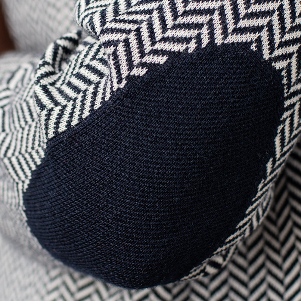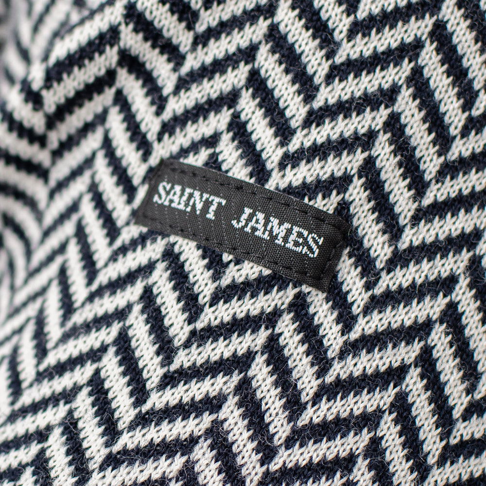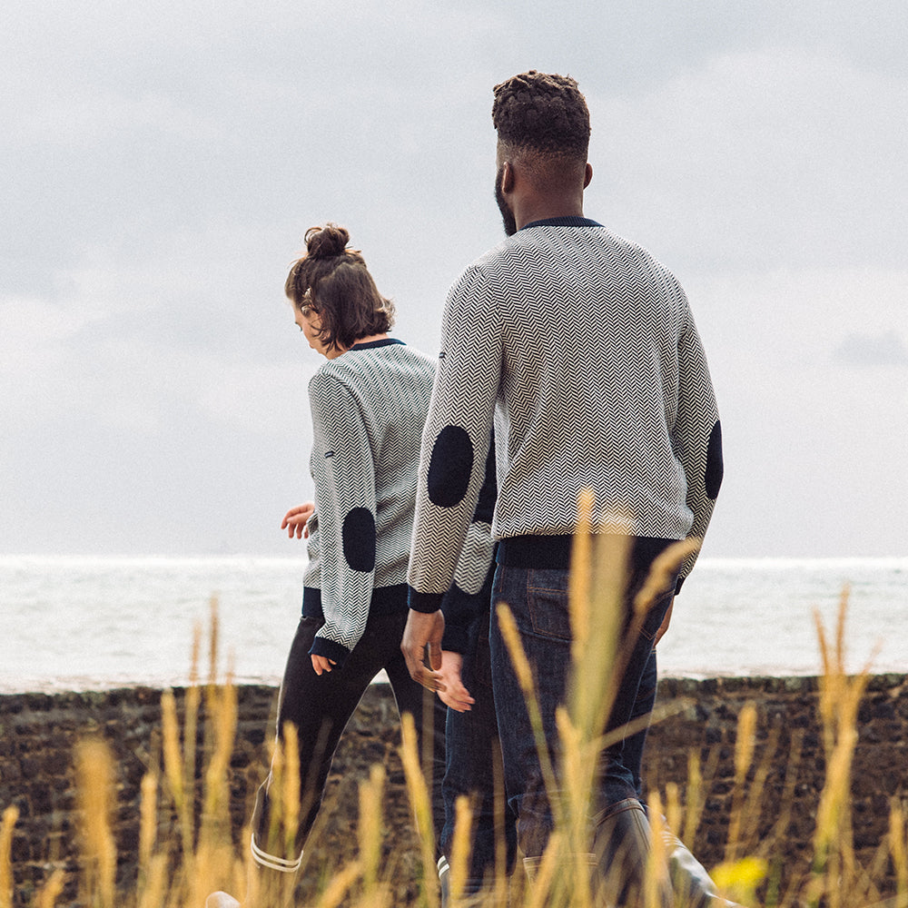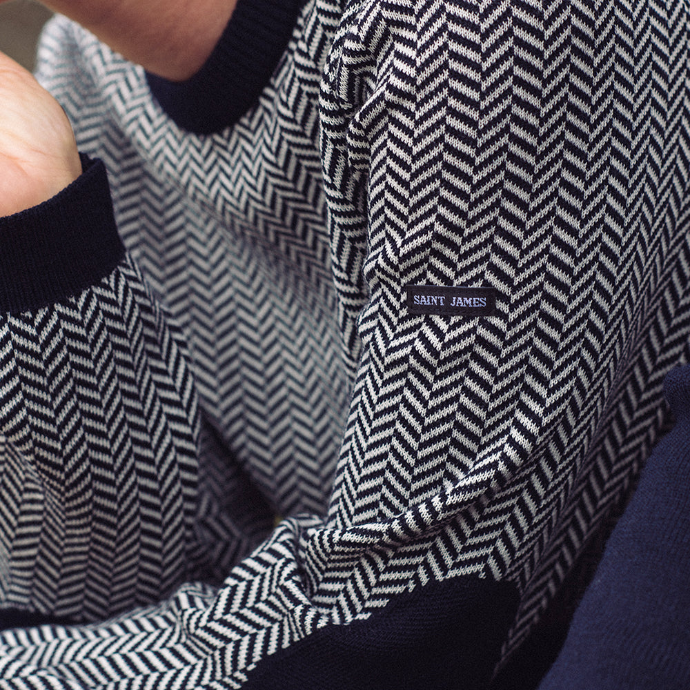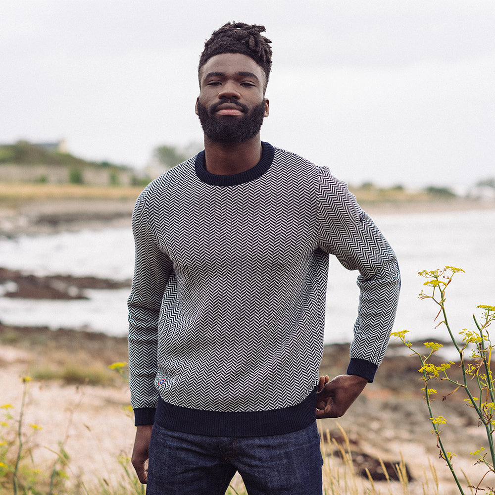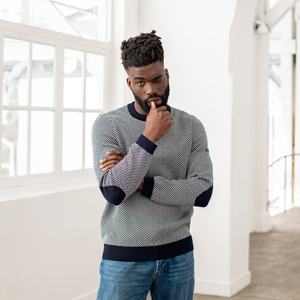 Pull Jubile en laine Mérinos à motif chevrons marine et coudières intégrées. La collaboration 100% Frenchy !