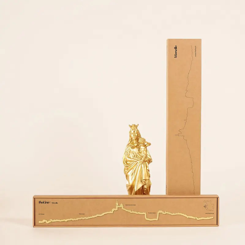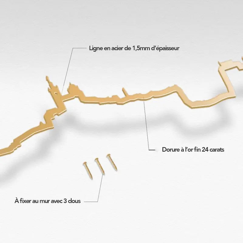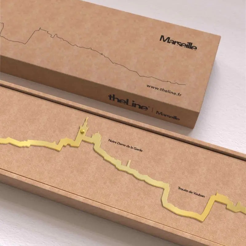 La silhouette murale The Line Marseille doré en acier plaqué or est une décoration murale unique. On y voit Malmousque, Notre-Dame-de-la-Garde, la trouée de Vauban et les collines du Roucas Blanc.