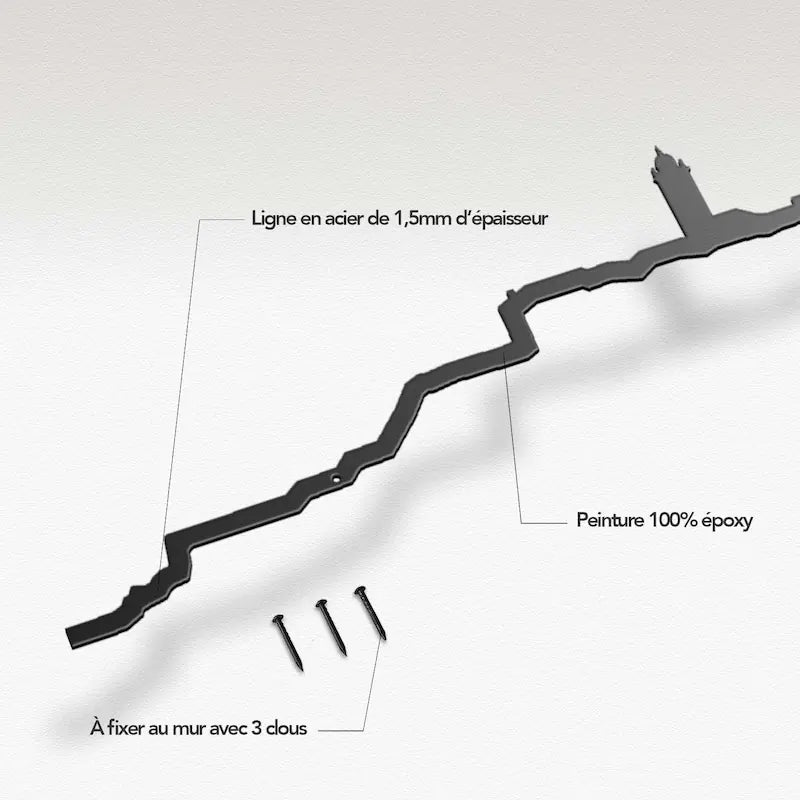 Découvrez la silhouette murale The Line Bastia vue depuis la mer Méditerranée. Cette œuvre élégante met en avant les monuments emblématiques de Bastia, notamment la Cathédrale Sainte-Marie, le Palais des Gouverneurs et la Citadelle de Bastia. Fabriqués en France, la silhouette murale est facile à installer ! Un marteau et trois clous (fournis) suffisent. Enfin, vous pouvez fixer la ligne au mur en intérieur comme en extérieur. Attention toutefois, cette ligne n’est pas adaptée pour les murs en brique ou en béton.