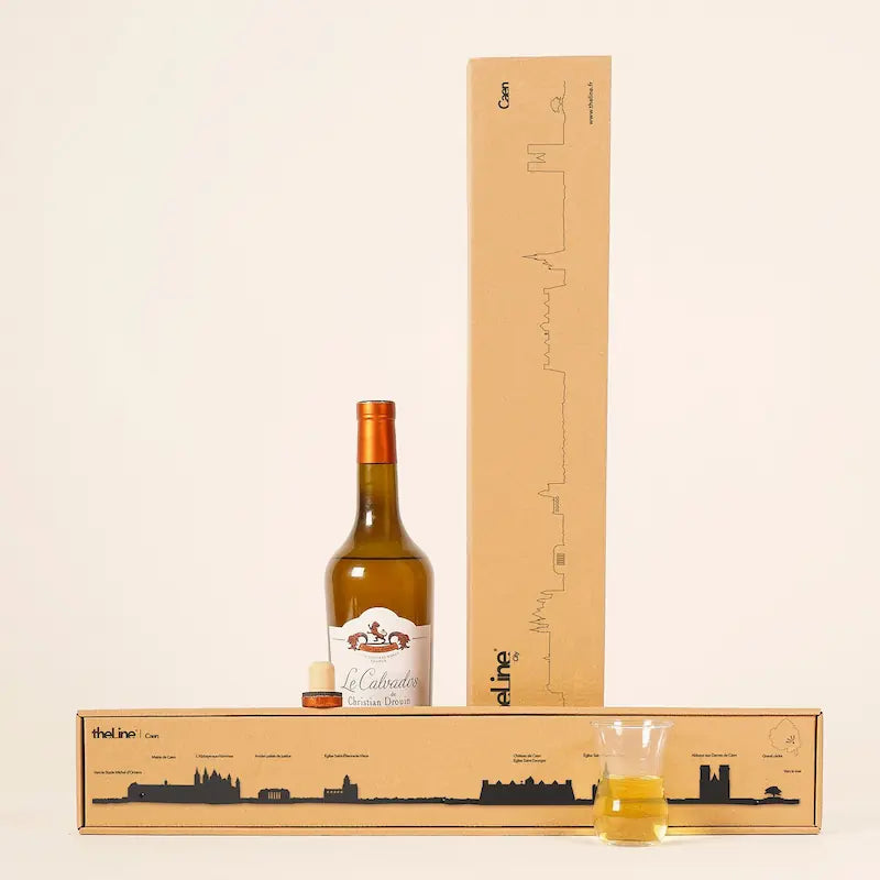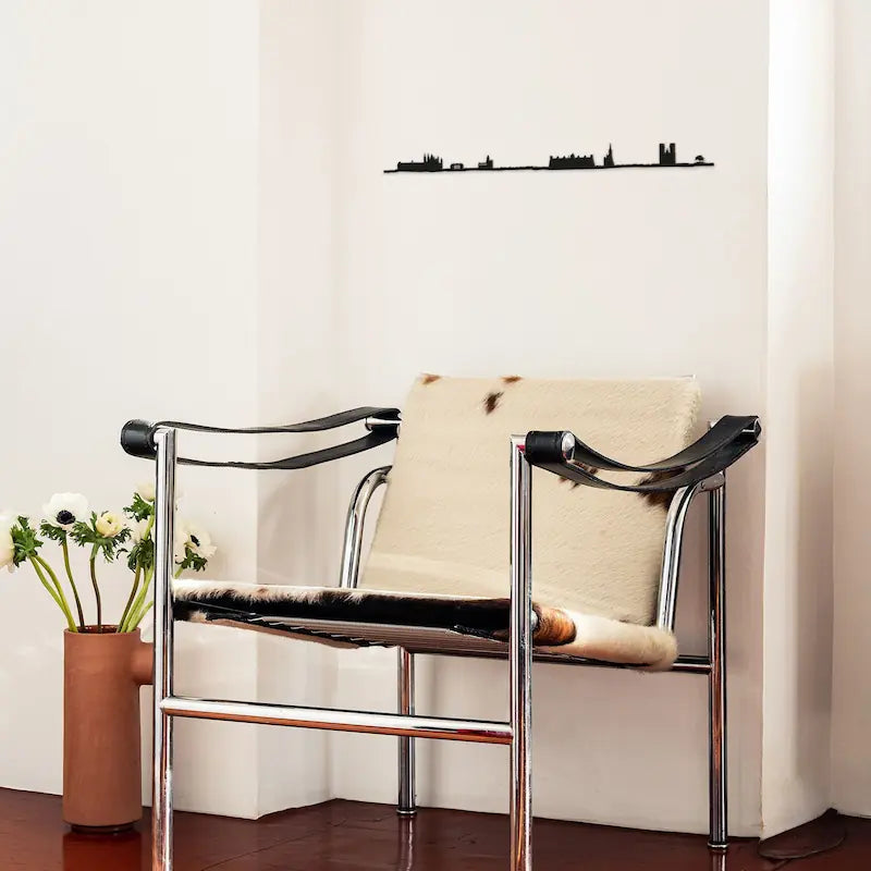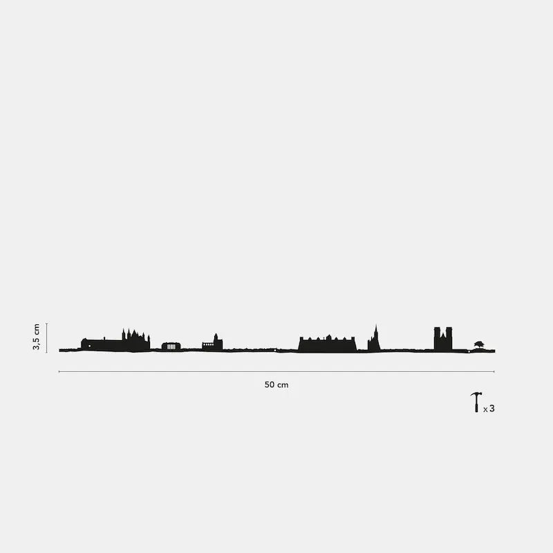 La silhouette murale The Line Caen en acier est une décoration murale unique. La vue est représentée depuis le sud de la ville. On y voit, d'ouest en est, entre autres, la mairie, l'Abbaye-aux-Hommes, l'ancien palais de justice, le château de Caen et le grand cèdre.