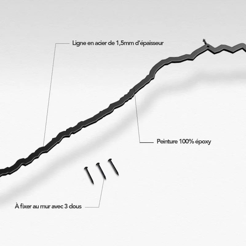 Découvrez la silhouette murale The Line en acier emblématique de la Montagne Sainte-Victoire, vue depuis la pittoresque commune de Vauvenargues. En effet, la ligne en acier de 1,5 mm d’épaisseur représente avec précision les sommets qui composent le mont, tels que le Pic des Mouches et la célèbre Croix de Provence, qui se dresse fièrement et se distingue à des kilomètres à la ronde. La Montagne Sainte-Victoire est un majestueux massif calcaire qui domine le paysage aixois. Celui-ci jouit d'une renommée internationale, principalement grâce aux œuvres emblématiques de Paul Cézanne qui l'ont immortalisée. Par ailleurs, la silhouette murale est facile à installer ! Un marteau et trois clous (fournis) suffisent. Enfin, vous pouvez fixer la ligne au mur en intérieur comme en extérieur. Attention toutefois, cette ligne n'est pas adaptée pour les murs en brique ou en béton.