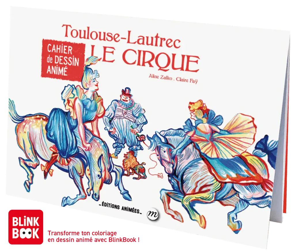 Découvrez le Cahier Éditions Animées Toulouse Lautrec. BlinkBook éditions animées, propose des livres à lire et colorier qui se transforme en dessin animé, à la croisée du livre et du numérique. Sous le chapiteau, les artistes du cirque s’animent. Clowns, éléphant, acrobates et voltigeuses se préparent à rentrer en piste. Toulouse-Lautrec est là, il les dessinera de mémoire. Colorie toi aussi ces personnages fascinants et tu découvriras un monde de mouvements et de couleurs.