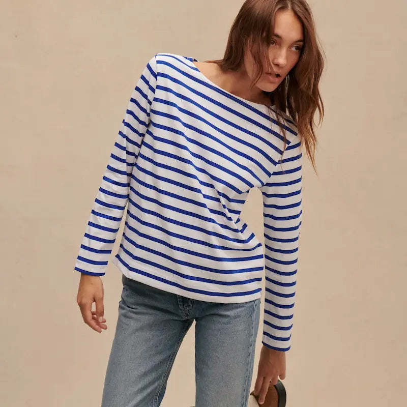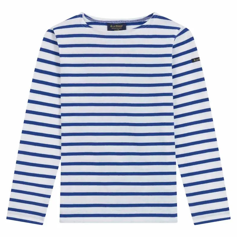 Découvrez la Marinière Le Minor bleu roy pour femme, un classique intemporel du style marin. Cette pièce emblématique, fabriquée à 100% en coton, incarne l'essence même du savoir-faire français. En effet, celle-ci est conçue dans l'usine Le Minor à Guidel, dans le Morbihan. C'est pourquoi cette marinière Blanc/Marine est un hommage à la tradition maritime bretonne. Polyvalente et facile à intégrer dans votre garde-robe, la marinière Le Minor s'adapte à tous les styles. Portez-la avec un jean et des baskets pour un look décontracté, ou associez-la à une veste de tailleur pour un effet coutume propre à Coco Chanel herself ! Que vous soyez sur terre ou en mer, cette marinière vous accompagnera dans toutes vos aventures avec élégance et confort.