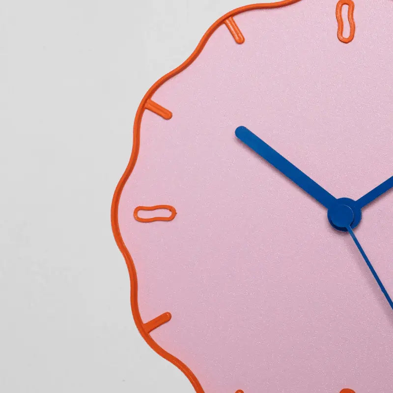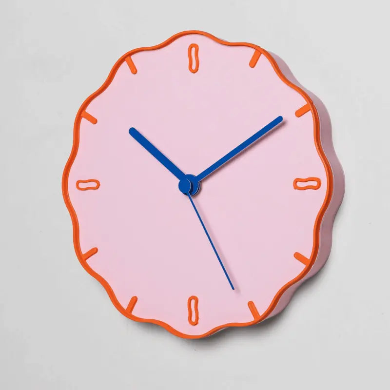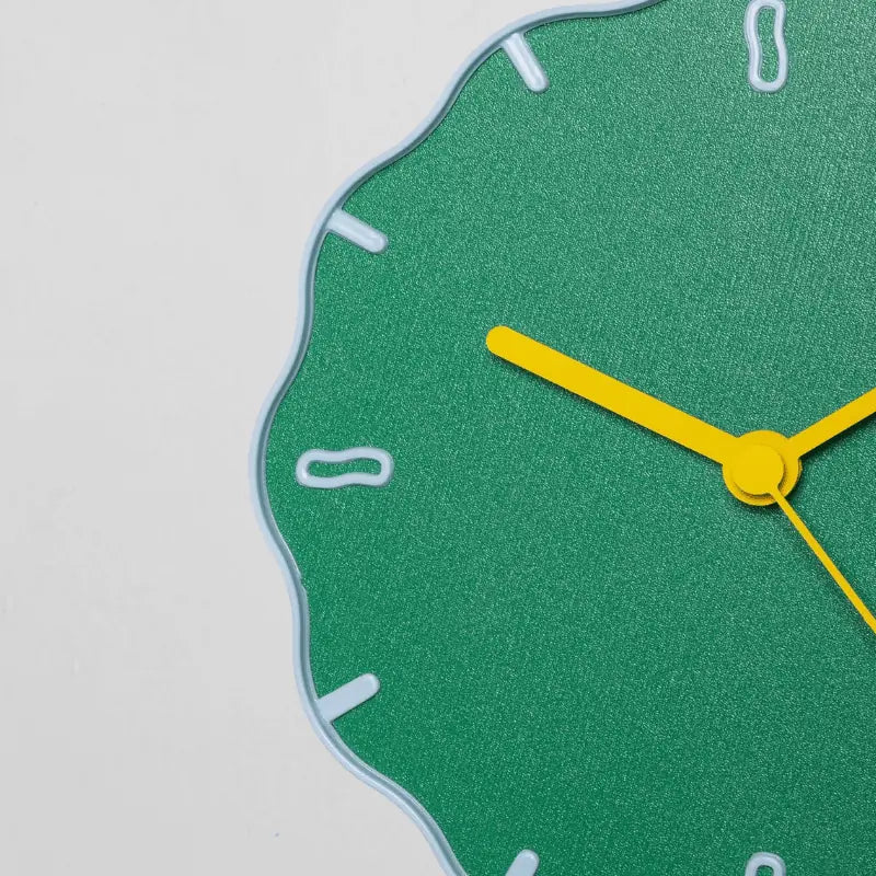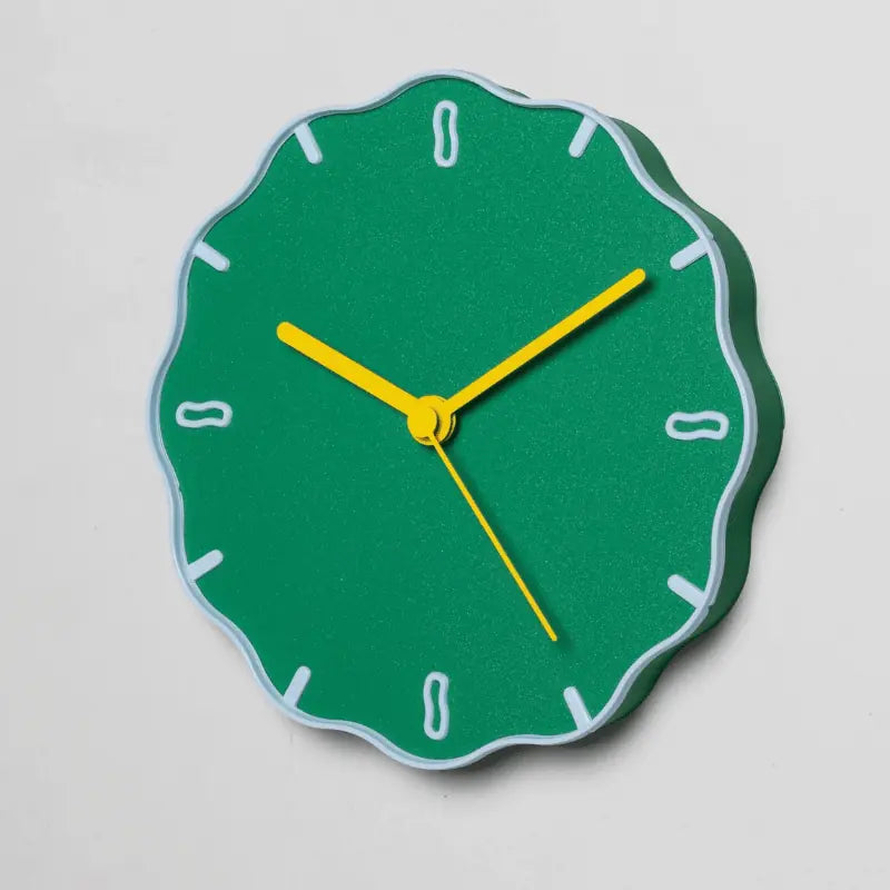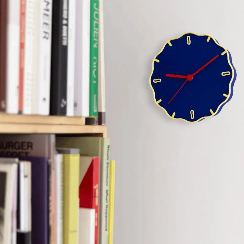 Découvrez l'horloge murale Warren & Laeticia Margherita, au dessin fluide et graphique. En effet, son cadran se distingue par une forme ondulée, qui rompt avec les formes classiques de l’horloge et crée un effet visuel doux et organique. De plus, son format intermédiaire (22 cm de diamètre) lui permet de s’intégrer aussi bien dans une cuisine, un bureau, qu’une salle à manger, apportant une touche visuelle simple et coloré. Chaque élément – le fond, le marquage des heures/ minutes et les aiguilles – est traité dans une couleur distincte, choisie pour créer un contraste équilibré. Cette séparation visuelle claire permet non seulement une lecture fluide de l’heure, mais contribue aussi à l’harmonie graphique de l’ensemble, en jouant sur la complémentarité des teintes et des formes.