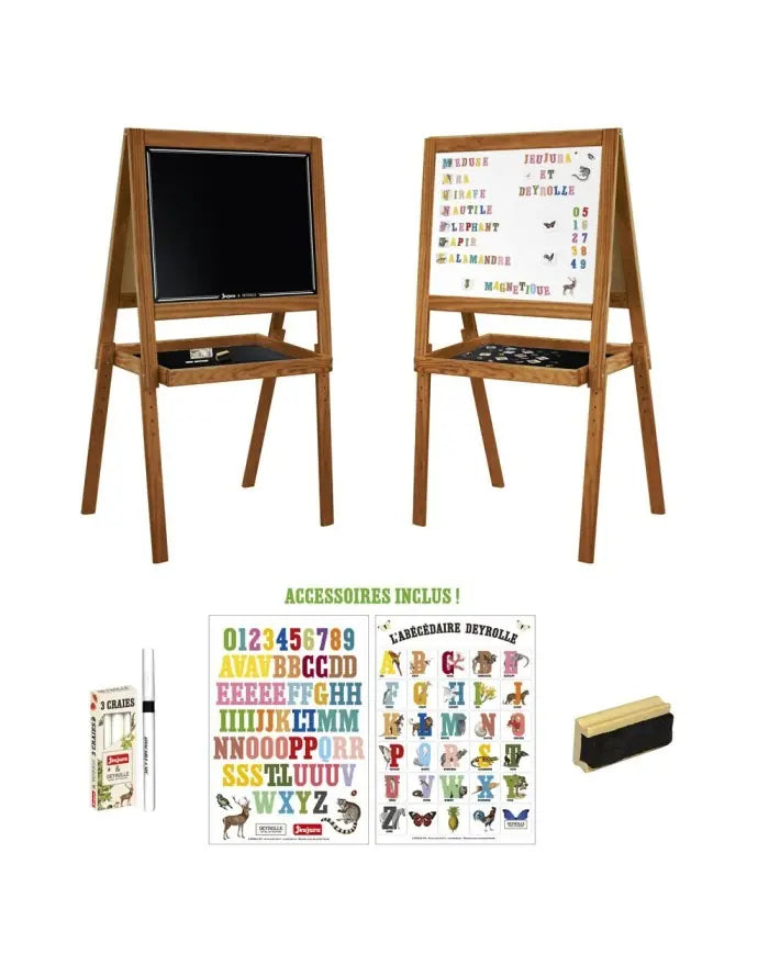 Offrez à votre enfant un tableau multifonctions élégant en bois teinté chêne, combinant ardoise pour craie et ardoise blanche magnétique. Idéal pour l’apprentissage de l’écriture et de la lecture, il permet également de jouer et découvrir grâce à plus de 100 magnets souples illustrés par Deyrolle (Abécédaire, Lettres et Chiffres).