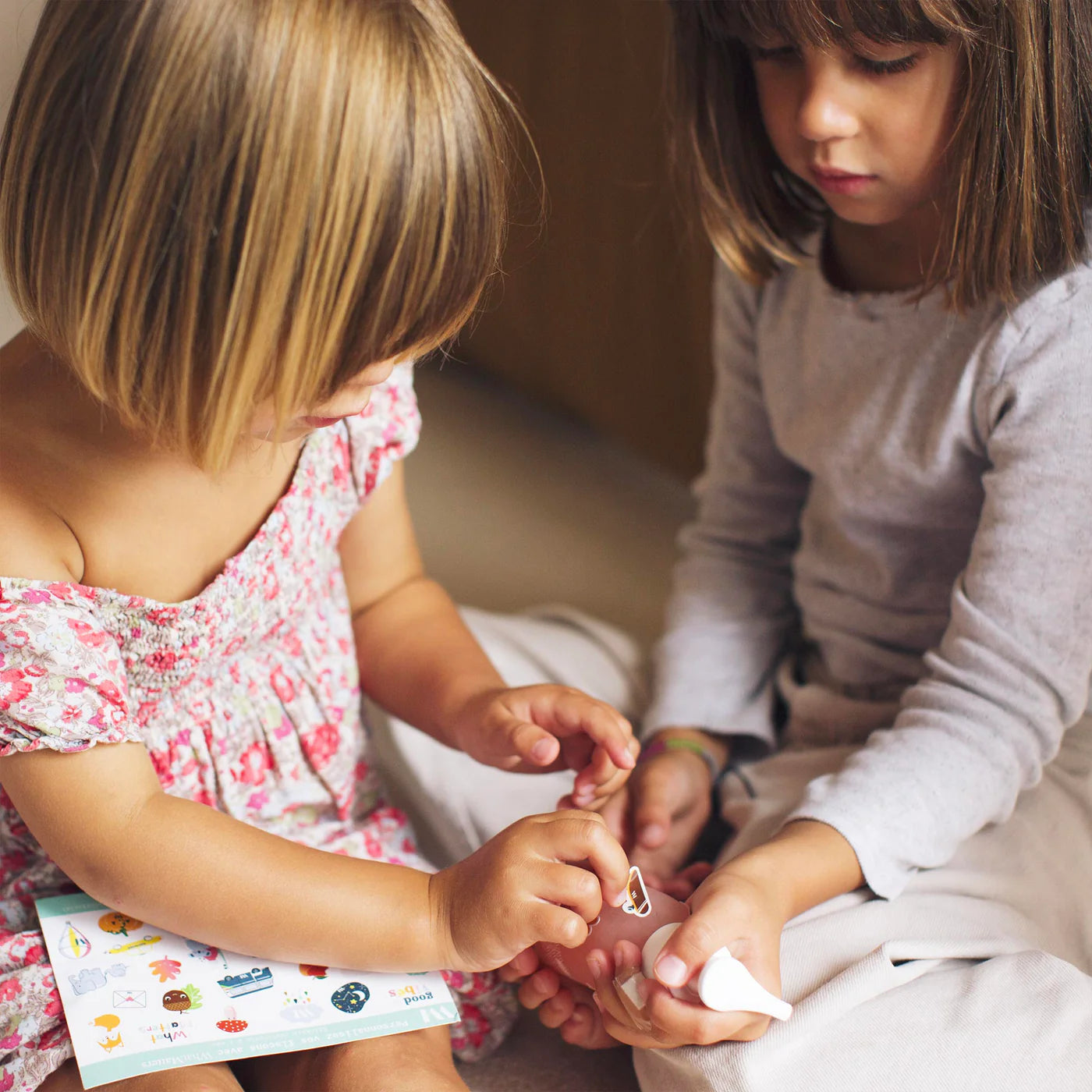 Le sablier 3 minutes rend l'autonomie amusante : retournez-le et le temps de brossage parfait est assuré ! Une planche de stickers ludiques permet de décorer le flacon verre renforcé®, transformant l'objet en trésor personnel. La trousse 100% coton range tout pour les déplacements — crèche, vacances, garde.